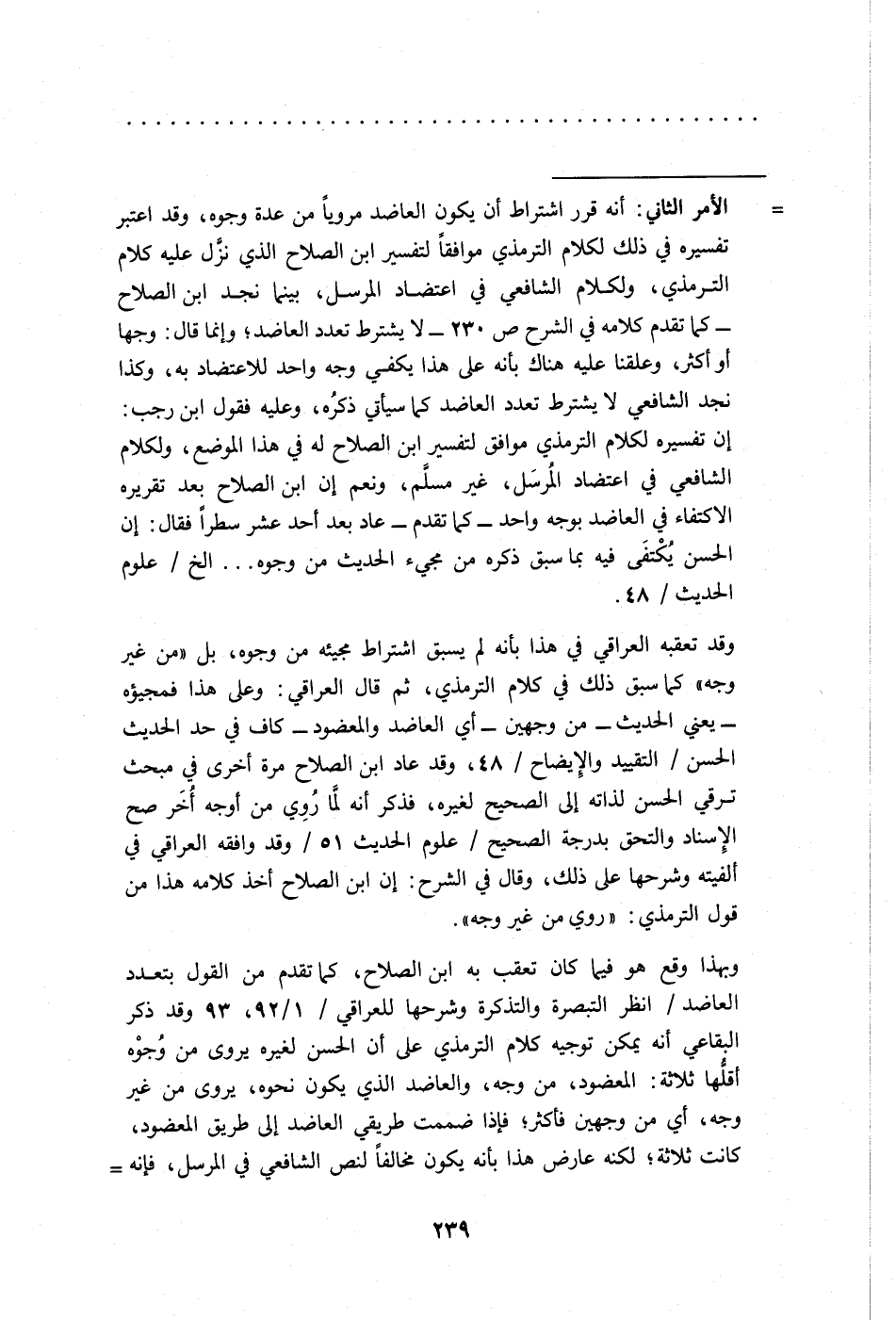= الأمر الثاني: أنه قرر اشتراط أن يكون العاضد مرويًا من عدة وجوه، وقد اعتبر تفسيره في ذلك لكلام الترمذي موافقًا لتفسير ابن الصلاح الذي نزَّل عليه كلام الترمذي، ولكلام الشافعي في اعتضاد المرسل، بينما نجد ابن الصلاح -كما تقدم كلامه في الشرح ص 230 - لا يشترط تعدد العاضد؛ وإنما قال: وجها أو أكثر، وعلقنا عليه هناك بأنه على هذا يكفي وجه واحد للاعتضاد به، وكذا نجد الشافعي لا يشترط تعدد العاضد كما سيأتي ذكرة، وعليه فقول ابن رجب: إن تفسيره لكلام الترمذي موافق لتفسير ابن الصلاح له في هذا الموضع، ولكلام الشافعي في اعتضاد المُرسَل، غير مسلَّم، ونعم إن ابن الصلاح بعد تقريره الاكتفاء في العاضد بوجه واحد -كما تقدم- عاد بعد أحد عشر سطرًا فقال: إن الحسن يُكْتفَى فيه بماسبق ذكره من مجيء الحديث من وجوه ... الخ/ علوم الحديث/ 48.