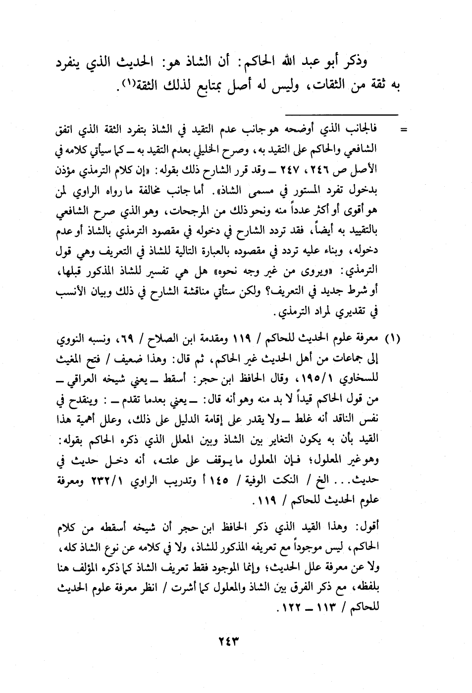 (¬1) معرفة علوم الحديث للحاكم/ 119 ومقدمة ابن الصلاح/ 69، ونسبه النووي إلى جماعات من أهل الحديث غير الحاكم، ثم قال: وهذا ضعيف/ فتح المغيث للسخاوي 1/ 195، وقال الحافظ ابن حجر: أسقط -يعني شيخه العراقي- من قول الحاكم قيدًا لا بد منه وهو أنه قال:-يعني بعدما تقدم-: وينقدح في نفس الناقد أنه غلط - ولا يقدر على إقامة الدليل على ذلك، وعلل أهمية هذا القيد بأن به يكون التغاير بين الشاذ وبين المعلل الذي ذكره الحاكم بقوله: وهو غير المعلول؛ فإن المعلول ما يوقف على علته، أنه دخل حديث في حديث ... الخ/ النكت الوفية/ 145 أوتدريب الراوي 1/ 232 ومعرفة علوم الحديث للحاكم/ 119.