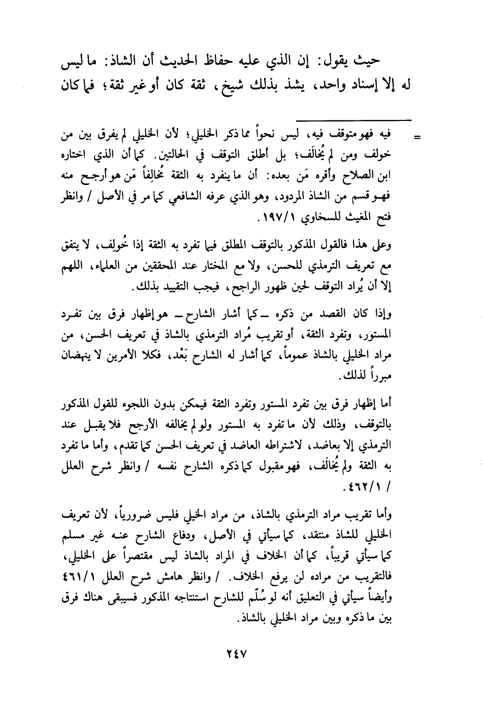 وأما تقريب مراد الترمذي بالشاذ، من مراد الخيلي فليس ضروريًا، لأن تعريف الخليلي للشاذ منتقد، كما سيأتي في الأصل، ودفاع الشارح عنه غير مسلم كما سيأتي قريبًا، كما أن الخلاف في المراد بالشاذ ليس مقتصرًا على الخليلي، فالتقريب من مراده لن يرفع الخلاف./ وانظر هامش شرح العلل 1/ 461 وأيضًا سيأتي في التعليق أنه لو سُلّم للشارح استنتاجه المذكور فسيبقى هناك فرق بين ما ذكره وبين مراد الخليلي بالشاذ.