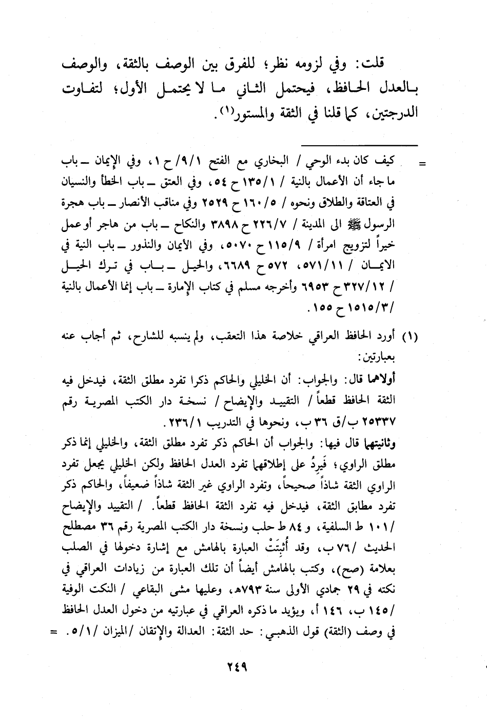 وثانيتهما قال فيها: والجواب أن الحاكم ذكر تفرد مطلق الثقة، والخليلي إنما ذكر مطلق الراوي؛ فَيرِدُ على إطلاقهما تفرد العدل الحافظ ولكن الخليلي يجعل تفرد الراوي الثقة شاذًا صحيحًا، وتفرد الراوي غير الثقة شاذًا ضعيفًا، والحاكم ذكر تفرد مطابق الثقة، فيدخل فيه تفرد الثقة الحافظ قطعًا./ التقييد والإيضاح / 101 ط السلفية، و 84 ط حلب ونسخة دار الكتب المصرية رقم 36 مصطلح الحديث/ 76 ب، وقد أُثبِتَتْ العبارة بالهامش مع إشارة دخولها في الصلب بعلامة (صح)، وكتب بالهامش أيضًا أن تلك العبارة من زيادات العراقي في نكته في 29 جمادي الأولى سنة 793 هـ، وعليها مشى البقاعي/ النكت الوفية / 145 ب، 146 أ، ويؤيد ما ذكره العراقي في عبارتيه من دخول العدل الحافظ في وصف (الثقة) قول الذهبي: حد الثقة: العدالة والإِتقان/ الميزان/ 1/ 5. =