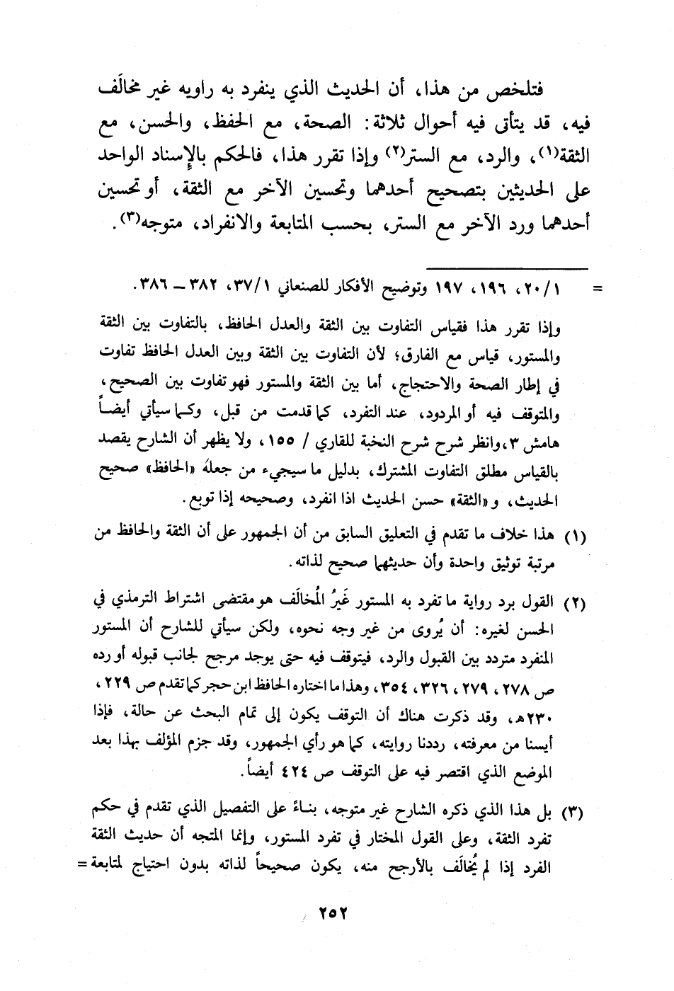 وإذا تقرر هذا فقياس التفاوت بين الثقة والعدل الحافظ، بالتفاوت بين الثقة والمستور، قياس مع الفارق؛ لأن التفاوت بين الثقة وبين العدل الحافظ تفاوت في إطار الصحة والاحتجاج، أما بين الثقة والمستور فهو تفاوت بين الصحيح، والمتوقف فيه أو المردود، عند التفرد، كما قدمت من قبل، وكما سيأتي أيضًا هامش 3، وانظر شرح شرح النخبة للقاري/ 155، ولا يظهر أن الشارح يقصد بالقياس مطلق التفاوت المشترك، بدليل ما سيجيء من جعله "الحافظ" صحيح الحديث، و"الثقة" حسن الحديث اذا انفرد، وصحيحه إذا توبع.