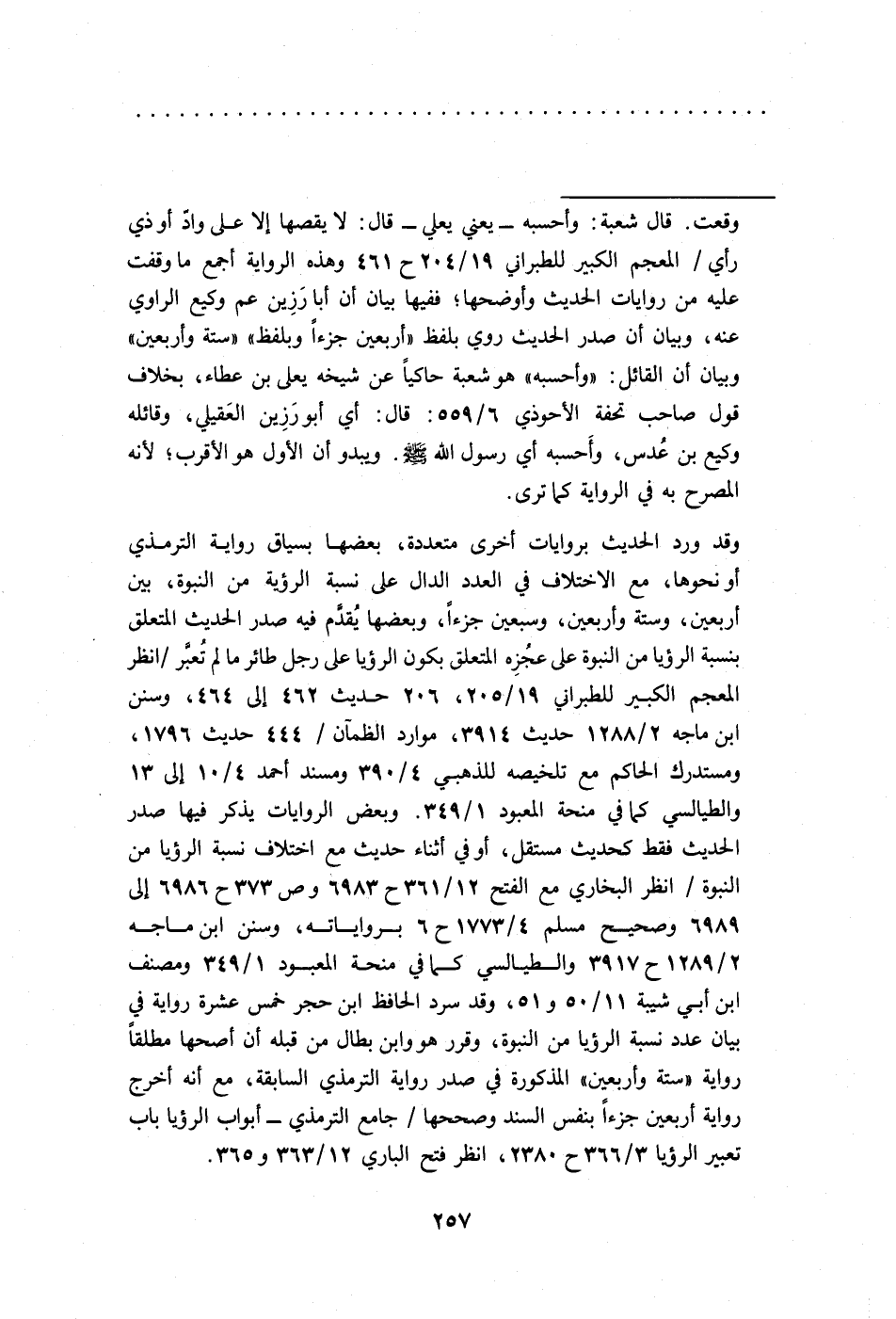 = وقعت. قال شعبة: وأحسبه -يعني يعلي- قال: لا يقصها إلا على وادّ أو ذي رأي/ المعجم الكبير للطبراني 19/ 204 ح 461 وهذه الرواية أجمع ما وقفت عليه من روايات الحديث وأوضحها؛ ففيها بيان أن أبا رَزِين عم وكيع الراوي عنه، وبيان أن صدر الحديث روي بلفظ "أربعين جزءًا وبلفظ" "ستة وأربعين" وبيان أن القائل: "وأحسبه" هو شعبة حاكيًا عن شيخه يعلى بن عطاء، بخلاف قول صاحب تحفة الأحوذي 6/ 559: قال: أي أبو رَزِين العَقيلي، وقائله وكيع بن عُدس، وأَحسبه أي رسول الله -صلى الله عليه وسلم-. ويبدو أن الأول هو الأقرب؛ لأنه المصرح به في الرواية كما ترى.