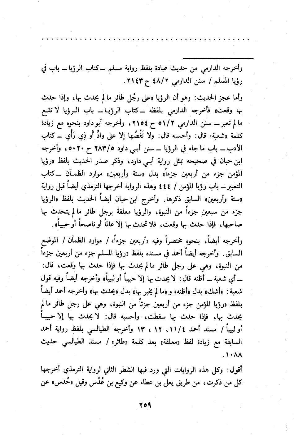 وأما عجز الحديث: وهو أن الرؤيا "على رجْل طائر ما لم يحدث بها، وإذا حدث بها وقعت" فأخرجه الدارمي بلفظه - كتاب الرؤيا - باب الرؤيا لا تقع ما لم تعبر- سنن الدارمي 2/ 51 ح 2154، وأخرجه أبو داود بنحوه مع زيادة كلمة "شعبة" قال: وأحسبه قال: ولا تَقُصَّها إلا على وادٍّ أَو ذِي رَأْي - كتاب الأدب - باب ما جاء في الرؤيا - سنن أبي داود 5/ 283 خ 5020، وأخرجه ابن حبان في صحيحه بمثل رواية أبي داود، وذكر صدر الحديث بلفظ "رؤيا المؤمن جزء من أربعين جزءًا" بدل "ستة وأربعين" موارد الظمآن - كتاب التعبير - باب رؤيا المؤمن/ 444 وهذه الرواية أخرجها الترمذي أيضًا قبل رواية "ستة وأربعين" السابق ذكرها. وأخرج ابن حبان أيضًا الحديث بلفظ "الرؤيا جزء من سبعين جزءًا من النبوة، والرؤيا معلقة برجل طائر ما لم يتحدث بها صاحبها، فإذا حدث بها وقعت، فلا تحدث بها إلا عالمًا أو ناصحًا أو حبيبًا".