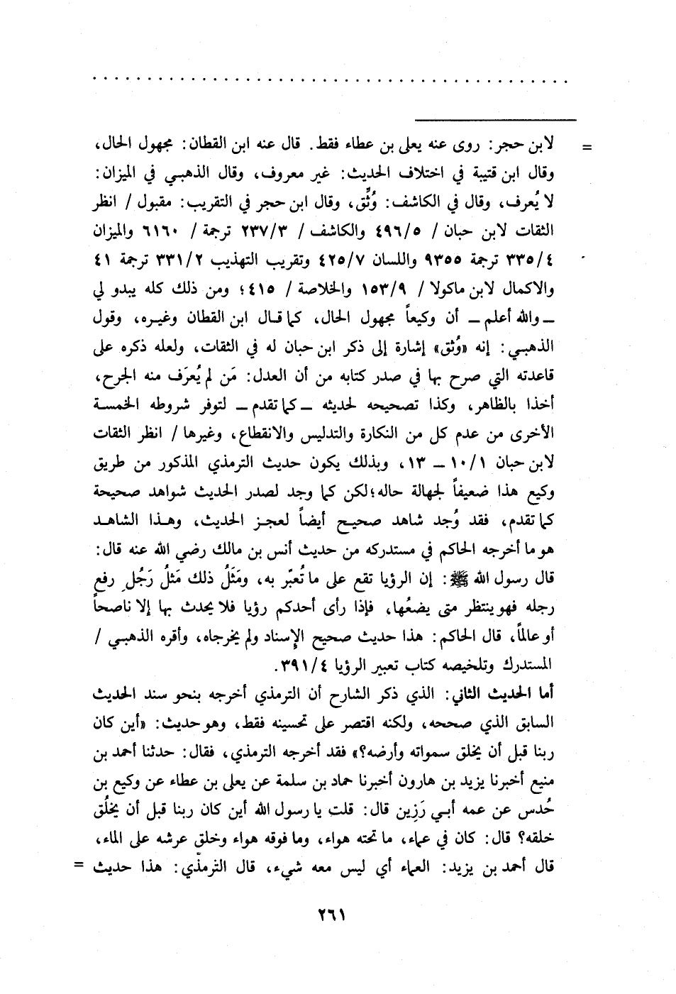 = لابن حجر: روى عنه يعلى بن عطاء فقط. قال عنه ابن القطان: مجهول الحال، وقال ابن قتيبة في اختلاف الحديث: غير معروف، وقال الذهبي في الميزان: لا يُعرف، وقال في الكاشف: وُثِّق، وقال ابن حجر في التقريب: مقبول/ انظر الثقات لابن حبان/ 5/ 496 والكاشف/ 3/ 237 ترجمة/ 6160 والميزان 4/ 335 ترجمة 9355 واللسان 7/ 425 وتقريب التهذيب 2/ 331 ترجمة 41 والاكمال لابن ماكولا/ 9/ 153 والخلاصة/ 415؛ ومن ذلك كله يبدو لي -والله أعلم- أن وكيعًا مجهول الحال، كا قال ابن القطان وغيره، وقول الذهبي: إنه "وُثق" إشارة الى ذكر ابن حبان له في الثقات، ولعله ذكره على قاعدته التي صرح بها في صدر كتابه من أن العدل: مَن لم يُعرَف منه الجرح، أخذا بالظاهر، وكذا تصحيحه لحديثه -كما تقدم- لتوفر شروطه الخمسة الأخرى من عدم كل من النكارة والتدليس والانقطاع، وغيرها/ انظر الثقات لابن حبان 1/ 10 - 13، وبذلك يكون حديث الترمذي المذكور من طريق وكيع هذا ضعيفًا لجهالة حاله؛ لكن كما وجد لصدر الحديث شواهد صحيحة كما تقدم، فقد وُجد شاهد صحيح أيضًا لعجز الحديث، وهذا الشاهد هو ما أخرجه الحاكم في مستدركه من حديث أنس بن مالك -رضي الله عنه- قال: قال رسول الله -صلى الله عليه وسلم-: إن الرؤيا تقع على ما تُعبّر به، ومَثَلُ ذلك مَثلُ رَجُلِ رفع رجله فهو ينتظر متى يضعُها، فإذا رأى أحدكم رؤيا فلا يحدث بها الا ناصحًا أو عالمًا، قال الحاكم: هذا حديث صحيح الإسناد ولم يخرجاه، وأقره الذهبي/ المستدرك وتلخيصه كتاب تعبير الرؤيا 4/ 391.