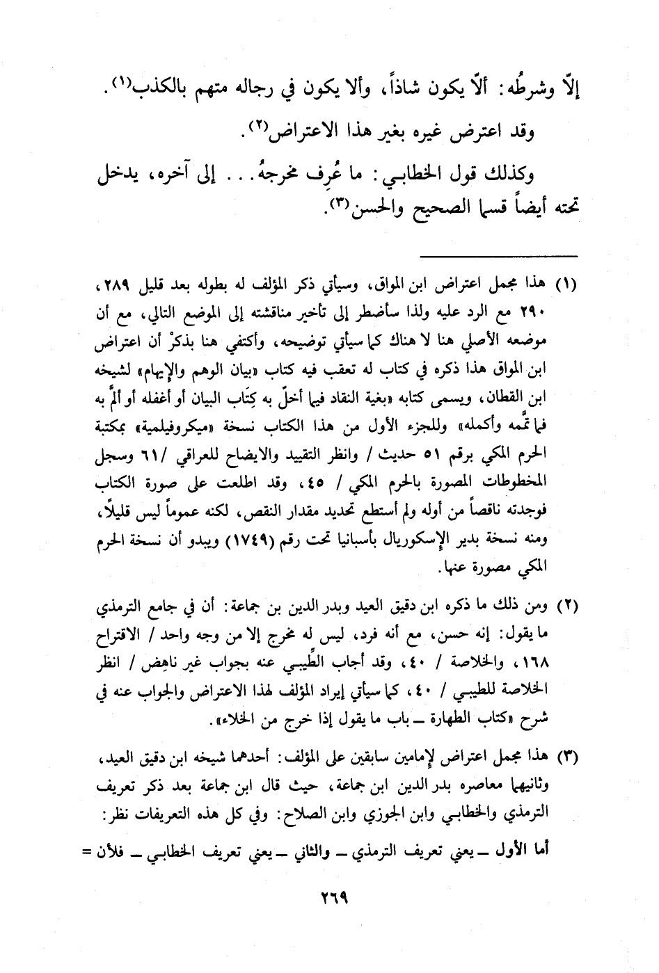 (¬3) هذا مجمل اعتراض لإمامين سابقين على المؤلف: أحدهما شيخه ابن دقيق العيد، وثانيهما معاصره بدر الدين ابن جماعة، حيث قال ابن جماعة بعد ذكر تعريف الترمذي والخطابي وابن الجوزي وابن الصلاح: وفي كل هذه التعريفات نظر: