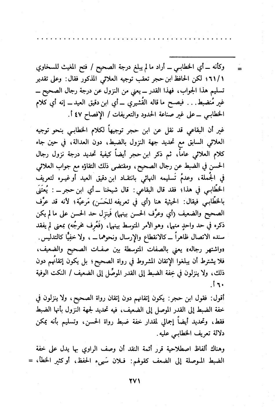 = وكأنه -أي الخطابي- أراد ما لم يبلغ درجة الصحيح/ فتح المغيث للسخاوي 1/ 61؛ لكن الحافظ ابن حجر تعقب توجيه العلائي المذكور فقال: وعلى تقدير تسليم هذا الجواب، فهذا القدر -يعني من النزول عن درجة رجال الصحيح- غير مُنضبط ... فيصح ما قاله القُشيري -أي ابن دقيق العيد- إنه أي كلام الخطابي - على غير صناعة الحدود والتعريفات/ الإفصاح 47 أ.