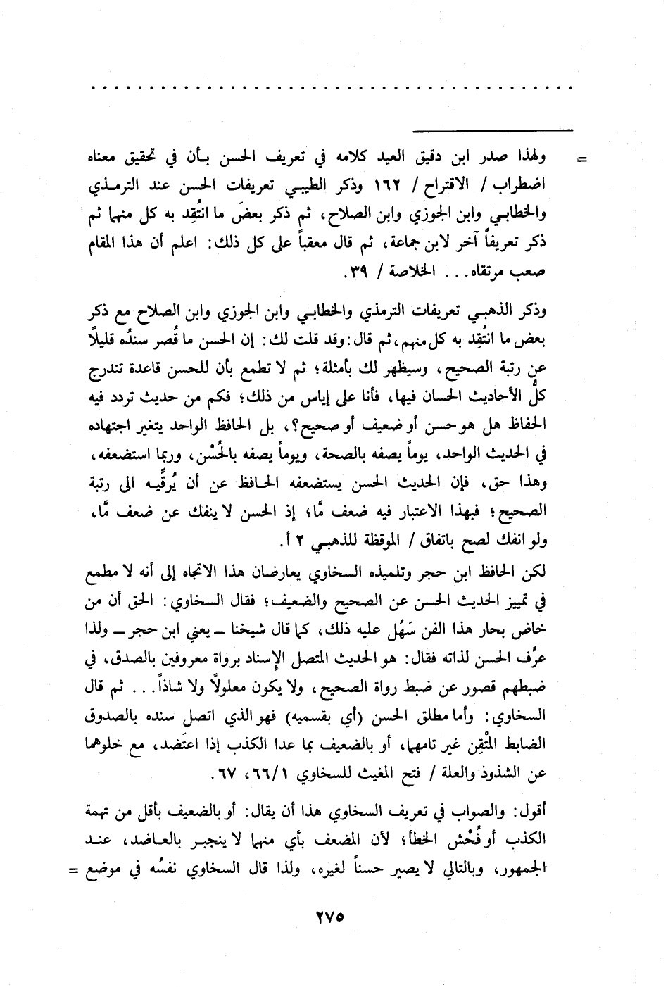 = ولهذا صدر ابن دقيق العيد كلامه في تعريف الحسن بأن في تحقيق معناه اضطراب/ الاقتراح/ 162 وذكر الطيبي تعريفات الحسن عند الترمذي والخطابي وابن الجوزي وابن الصلاح، ثم ذكر بعضَ ما انتُقِد به كل منهما ثم ذكر تعريفًا آخر لابن جماعة، ثم قال معقبًا على كل ذلك: اعلم أن هذا المقام صعب مرتقاه ... الخلاصة/ 39.