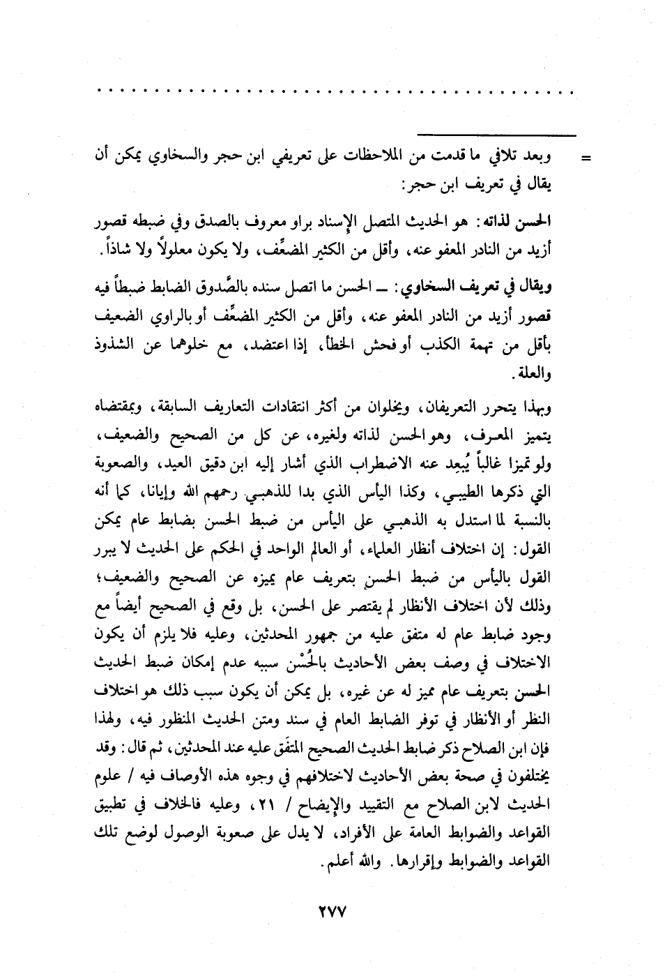 وبهذا يتحرر التعريفان، ويخلوان من أكثر انتقادات التعاريف السابقة، وبمقتضاه يتميز المعرف، وهو الحسن لذاته ولغيره، عن كل من الصحيح والضعيف، ولو تميزا غالبًا يُبعِد عنه الاضطراب الذي أشار إليه ابن دقيق العيد، والصعوبة التي ذكرها الطيبي، وكذا اليأس الذي بدا للذهبي رحمهم الله وإيانا، كما أنه بالنسبة لما استدل به الذهبي على اليأس من ضبط الحسن بضابط عام يمكن القول: إن اختلاف أنظار العلماء، أو العالم الواحد في الحكم على الحديث لا يبرر القول باليأس من ضبط الحسن بتعريف عام يميزه عن الصحيح والضعيف؛ وذلك لأن اختلاف الأنظار لم يقتصر على الحسن، بل وقع في الصحيح أيضًا مع وجود ضابط عام له متفق عليه من جمهور المحدثين، وعليه فلا يلزم أن يكون الاختلاف في وصف بعض الأحاديث بالحُسْن سببه عدم إمكان ضبط الحديث الحسن بتعريف عام مميز له عن غيره، بل يمكن أن يكون سبب ذلك هو اختلاف النظر أو الأنظار في توفر الضابط العام في سند ومتن الحديث النظور فيه، ولهذا فإن ابن الصلاح ذكر ضابط الحديث الصحيح المتفَق عليه عند المحدثين، ثم قال: وقد يختلفون في صحة بعض الأحاديث لاختلافهم في وجوه هذه الأوصاف فيه/ علوم الحديث لابن الصلاح مع التقييد والإيضاح/ 21، وعليه فالخلاف في تطبيق القواعد والضوابط العامة على الأفراد، لا يدل على صعوبة الوصول لوضع تلك القواعد والضوابط وإقرارها. والله أعلم.