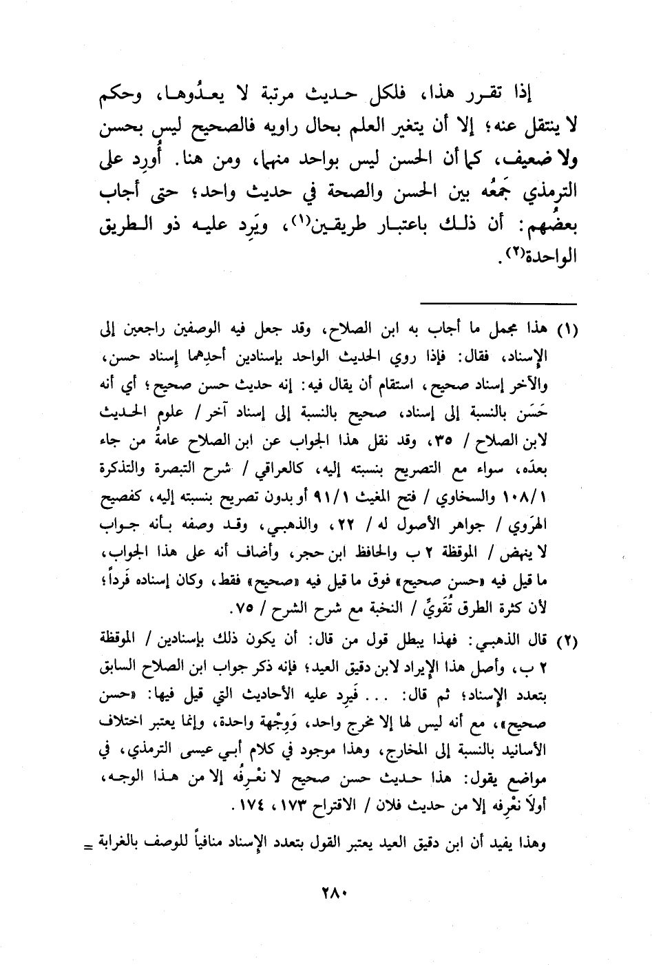 (¬1) هذا مجمل ما أجاب به ابن الصلاح، وقد جعل فيه الوصفين راجعين الى الإسناد، فقال: فإذا روي الحديث الواحد بإسنادين أحدِهما إسناد حسن، والآخر إسناد صحيح، استقام أن يقال فيه: إنه حديث حسن صحيح؛ أي أنه حَسَن بالنسبة الى إسناد، صحيح بالنسبة الى إسناد آخر/ علوم الحديث لابن الصلاح / 35، وقد نقل هذا الجواب عن ابن الصلاح عامةُ من جاء بعدَه، سواء مع التصريح بنسبته إليه، كالعراقي/ شرح التبصرة والتذكرة 1/ 108 والسخاوي / فتح المغيث 1/ 91 أو بدون تصريح بنسبته إليه، كفصيح الهرَوي/ جواهر الأصول له/ 22، والذهبي، وقد وصفه بأنه جواب لا ينهض/ الموقظة 2 ب والحافظ ابن حجر، وأضاف أنه على هذا الجواب، ما قيل فيه "حسن صحيح" فوق ما قيل فيه "صحيح" فقط، وكان إسناده فَردًا؛ لأن كثرة الطرق تُقَويِّ / النخبة مع شرح الشرح/ 75.