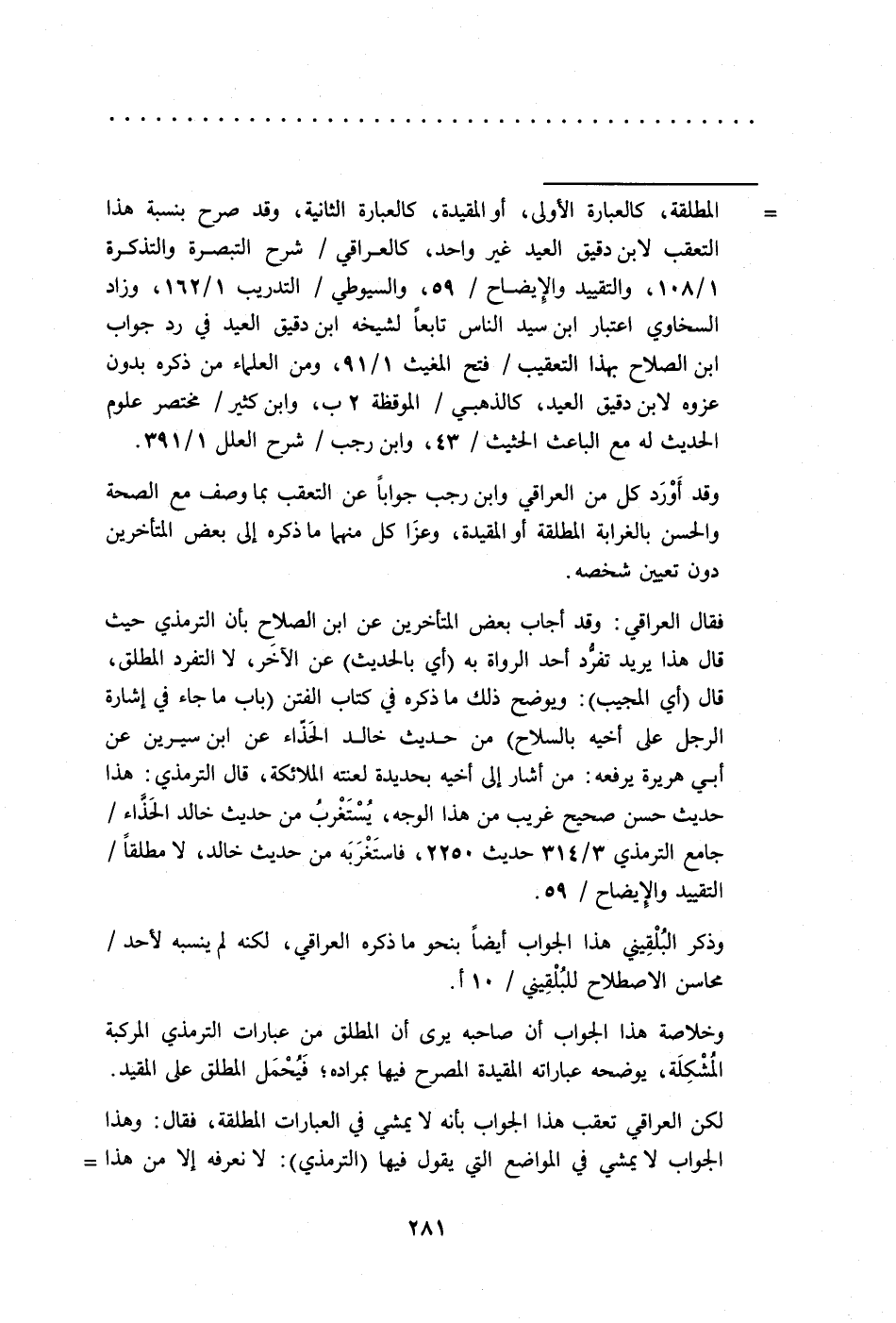 = المطلقة، كالعبارة الأولى، أو المقيدة، كالعبارة الثانية، وقد صرح بنسبة هذا التعقب لابن دقيق العيد غير واحد، كالعراقي/ شرح التبصرة والتذكرة 1/ 108، والتقييد والإيضاح/ 59، والسيوطي/ التدريب 1/ 162، وزاد السخاوي اعتبار ابن سيد الناس تابعًا لشيخه ابن دقيق العيد في رد جواب ابن الصلاح بهذا التعقيب/ فتح المغيث 1/ 91، ومن العلماء من ذكره بدون عزوه لابن دقيق العيد، كالذهبي/ الموقظة 2 ب، وابن كثير/ مختصر علوم الحديث له مع الباعث الحثيث / 43، وابن رجب/ شرح العلل 1/ 391.