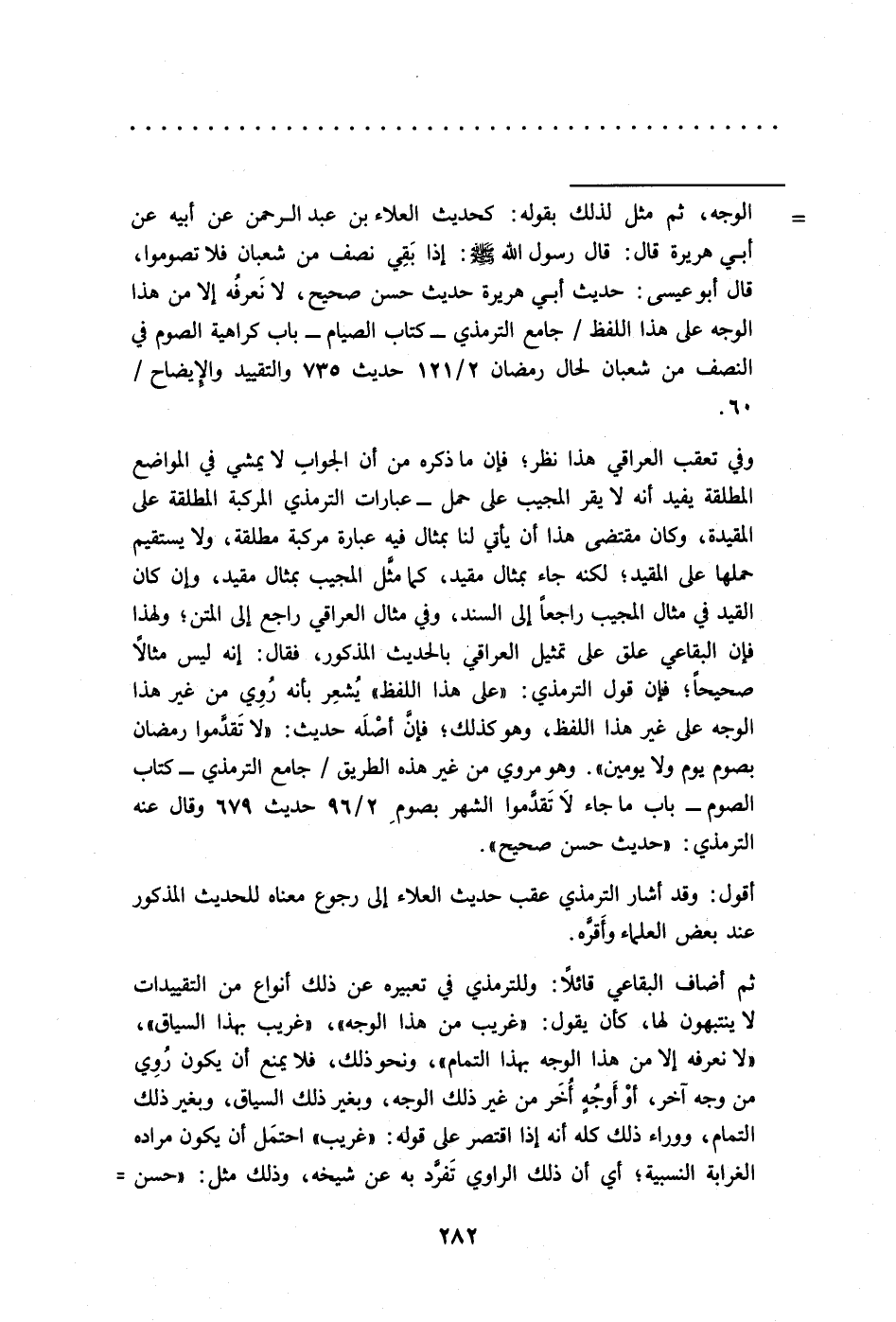 = الوجه، ثم مثل لذلك بقوله: كحديث العلاء بن عبد الرحمن عن أبيه عن أبي هريرة قال: قال رسول الله -صلى الله عليه وسلم-: إذا بَقِي نصف من شعبان فلا تصوموا، قال أبو عيسى: حديث أبي هريرة حديث حسن صحيح، لا نَعرفُه إلا من هذا الوجه على هذا اللفظ/ جامع الترمذي - كتاب الصيام - باب كراهية الصوم في النصف من شعبان لحال رمضان 2/ 121 حديث 735 والتقييد والإيضاح/ 60.