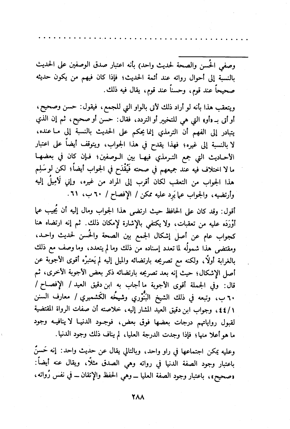 ويتعقب هذا بأنه لو أراد ذلك لأتى بالواو التي للجمع، فيقول: حسن وصحيح، أو أتى بـ"أو" التي هي للتخيير أو التردد، فقال: حسن أو صحيح، ثم إن الذي يتبادر إلى الفهم أن الترمذي إنما يحكم على الحديث بالنسبة إلى ما عنده، لا بالنسبة إلى غيره؛ فهذا يقدح في هذا الجواب، ويتوقف أيضًا على اعتبار الأحاديث التي جمع الترمذي فيها بين الوصفين؛ فإن كان في بعضها ما لا اختلاف فيه عند جميعهم في صحته فَيُقْدَح في الجواب أيضًا؛ لكن لو سَلِم هذا الجواب من التعقب لكان أقرب إلى المراد من غيره، وإني لَأمِيلُ إليه وأرتضيه، والجواب عما يَرِد عليه ممكن/ الإفصاح/ 60 ب، 61.