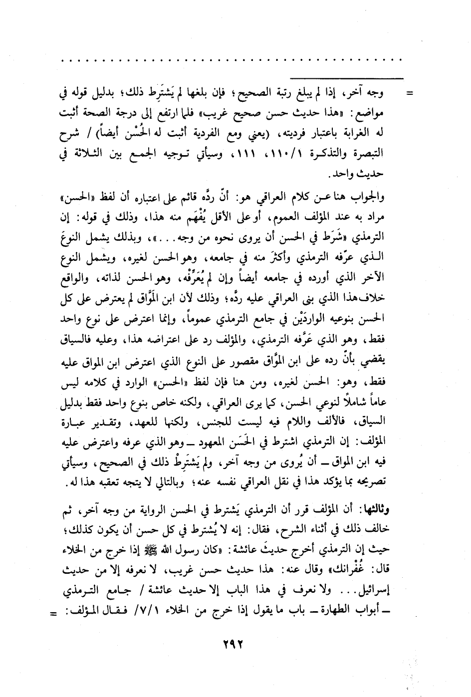 والجواب هنا عن كلام العراقي هو: أنّ ردَّه قائم على اعتباره أن لفظ "الحسن" مراد به عند المؤلف العموم، أوعلى الأقل يُفْهَم منه هذا، وذلك في قوله: إن الترمذي "شَرَط في الحسن أن يروى نحوه من وجه ... "، وبذلك يشمل النوعَ الذي عرّفه الترمذي وأكثر منه في جامعه، وهو الحسن لغيره، ويشمل النوع الآخر الذي أورده في جامعه أيضًا وإن لم يُعَرِّفْه، وهو الحسن لذاته، والواقع خلاف هذا الذي بنى العراقي عليه ردَّه؛ وذلك لأن ابن المَوَّاق لم يعترض على كل الحسن بنوعيه الواردَيْن في جامع الترمذي عمومًا، وإنما اعترض على نوع واحد فقط، وهو الذي عَرَّفه الترمذي، والمؤلف رد على اعتراضه هذا، وعليه فالسياق يقضي بأنّ رده على ابن الموَّاق مقصور على النوع الذي اعترض ابن المواق عليه فقط، وهو: الحسن لغيره، ومن هنا فإن لفظ "الحسن" الوارد في كلامه ليس عامًا شاملًا لنوعي الحسن، كما يرى العراقي، ولكنه خاص بنوع واحد فقط بدليل السياق، فالألف واللام فيه ليست للجنس، ولكنها للعهد، وتقدير عبارة المؤلف: إن الترمذي اشترط في الحَسَن المعهود -وهو الذي عرفه واعترض عليه فيه ابن المواق- أن يُروى من وجه آخر، ولم يَشتَرِطْ ذلك في الصحيح، وسيأتي تصريحه بما يؤكد هذا في نقل العراقي نفسه عنه؛ وبالتالي لا يتجه تعقبه هذا له.