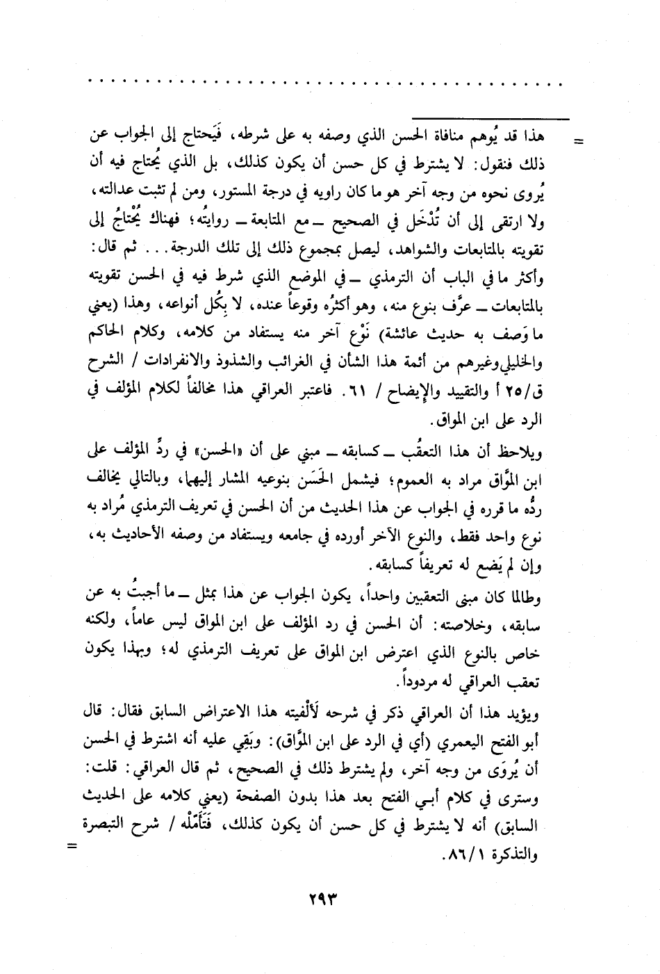 = هذا قد يُوهم منافاة الحسن الذي وصفه به على شرطه، فَيَحتاج إلى الجواب عن ذلك فنقول: لا يشترط في كل حسن أن يكون كذلك، بل الذي يُحتاج فيه أن يُروى نحوه من وجه آخر هو ما كان راويه في درجة المستور، ومن لم تثبت عدالته، ولا ارتقى الى أن تُدْخَل في الصحيح -مع المتابعة- روايتُه؛ فهناك يُحْتاجُ الى تقويته بالمتابعات والشواهد، ليصل بمجموع ذلك إلى تلك الدرجة ... ثم قال: وأكثر ما في الباب أن الترمذي -في الموضع الذي شرط فيه في الحسن تقويته بالمتابعات- عرَّف بنوع منه، وهو أكثرُه وقوعًا عنده، لا بِكُل أنواعه، وهذا (يعني ما وَصف به حديث عاثشة) نَوْع آخر منه يستفاد من كلامه، وكلام الحاكم والخليلي وغيرهم من أئمة هذا الشأن في الغرائب والشذوذ والانفرادات/ الشرح ق/ 25 أوالتقييد والإِيضاح/ 61. فاعتبر العراقي هذا مخالفًا لكلام المؤلف في الرد على ابن المواق.