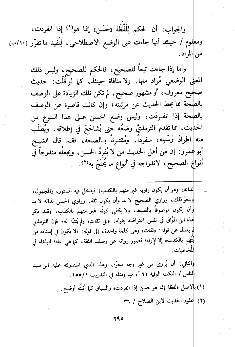 وأما إذا جاءت تبعًا للصحيح، فالحكم للصحيح، وليس ذلك المعنى الوضعي مُراد منها. ولا منافاة حينئذ، كما لو قُلْتَ: حديث صحيح معروف، أو مشهور صحيح، لم تكن تلك الزيادة على الوصف بالصحة إذا مما يحط الحديث عن مرتبته؛ وإن كانت قاصرة عن الوصف بالصحة إذا انفردَت، وليس وضع الحسن على هذا النوع من الحديث، مما تقدم الترمذيَّ وضعُه حتى يُشاحَحَ في إطلاقه، ويُطلَب منه اطرادُ رَسْمِه، منفردًا، ومُقترِنًا بالصحة، فقد قال الشيخ أبو عمرو: إن من أهل الحديث من لا يُفرِدُ الحسن، ويجعلُه مندرجًا في أنواع الصحيح، لاندراجه في أنواع ما يُحتَجّ به (¬2).
