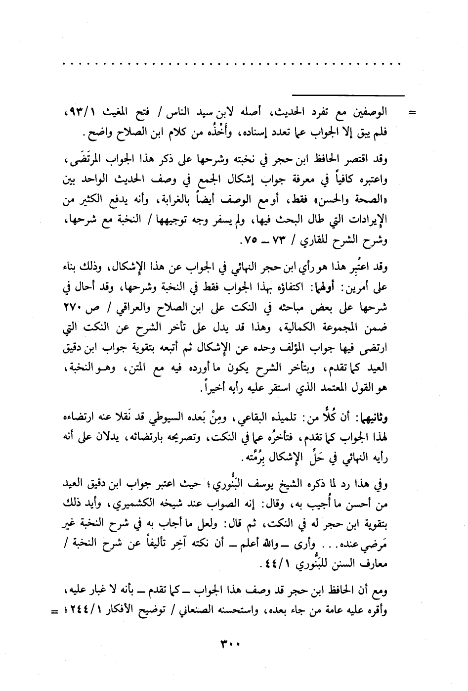 وفي هذا رد لما ذكره الشيخ يوسف البَنُّوري؛ حيث اعتبر جواب ابن دقيق العيد من أحسن ما أُجيب به، وقال: إنه الصواب عند شيخه الكشميري، وأيد ذلك بتقوية ابن حجر له في النكت، ثم قال: ولعل ما أجاب به في شرح النخبة غير مَرضي عنده ... وأرى -والله أعلم- أن نكته آخِر تأليفًا عن شرح النخبة/ معارف السنن للبَنُّوري 1/ 44.