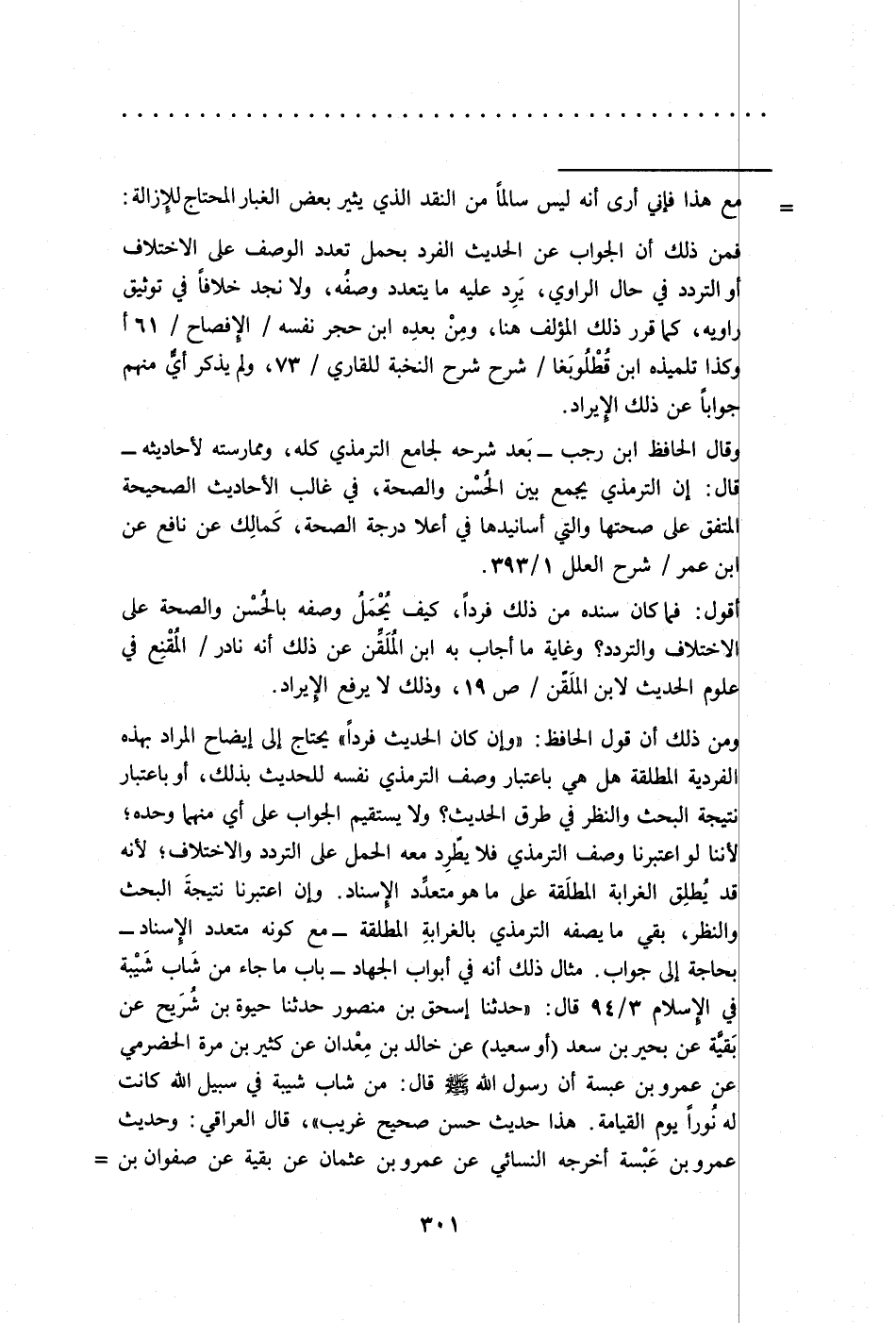 ومن ذلك أن قول الحافظ: "وإن كان الحديث فردًا" يحتاج الى إيضاح المراد بهذه الفردية المطلقة هل هي باعتبار وصف الترمذي نفسه للحديث بذلك، أو باعتبار نتيجة البحث والنظر في طرق الحديث؟ ولا يستقيم الجواب على أي منهما وحده؛ لأننا لو اعتبرنا وصف الترمذي فلا يطّرِد معه الحمل على التردد والاختلاف؛ لأنه قد يُطلِق الغرابة المطلَقة على ما هو متعدِّد الإسناد. كان اعتبرنا نتيجةَ البحث والنظر، بقي ما يصفه الترمذي بالغرابةِ المطلقة -مع كونه متعدد الإسناد- بحاجة الى جواب. مثال ذلك أنه في أبواب الجهاد - باب ما جاء من شَاب شَيْبة في الإسلام 3/ 94 قال: "حدثنا إسحق بن منصور حدثنا حيوة بن شُرَيح عن بَقيَّة عن بحير بن سعد (أو سعيد) عن خالد بن معْدان عن كثير بن مرة الحضرمي عن عمرو بن عبسة أن رسول الله -صلى الله عليه وسلم- قال: من شاب شيبة في سبيل الله كانت له نُورًا يوم القيامة. هذا حديث حسن صحيح غريب"، قال العراقي: وحديث عمرو بن عَبْسة أخرجه النسائي عن عمرو بن عثمان عن بقية عن صفوان بن =