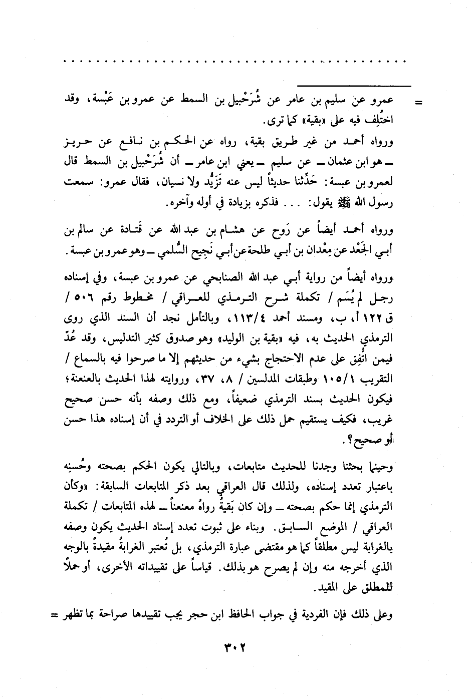 ورواه أيضًا من رواية أبي عبد الله الصنابحي عن عمرو بن عبسة، وفي إسناده رجل لم يُسَم/ تكملة شرح الترمذي للعراقي/ مخطوط رقم 506 / ق 122 أ، ب، ومسند أحمد 4/ 113، وبالتأمل نجد أن السند الذي روى الترمذي الحديث به، فيه "بقية بن الوليد" وهو صدوق كثير التدليس، وقد عُدّ فيمن اتُّفِق على عدم الاحتجاج بشيء من حديثهم إلا ما صرحوا فيه بالسماع/ التقريب 1/ 105 وطبقات المدلسين/ 8، 37، وروايته لهذا الحديث بالعنعنة؛ فيكون الحديث بسند الترمذي ضعيفًا، ومع ذلك وصفه بأنه حسن صحيح غريب، فكيف يستقيم حمل ذلك على الخلاف أو التردد في أن إسناده هذا حسن أو صحيح؟.