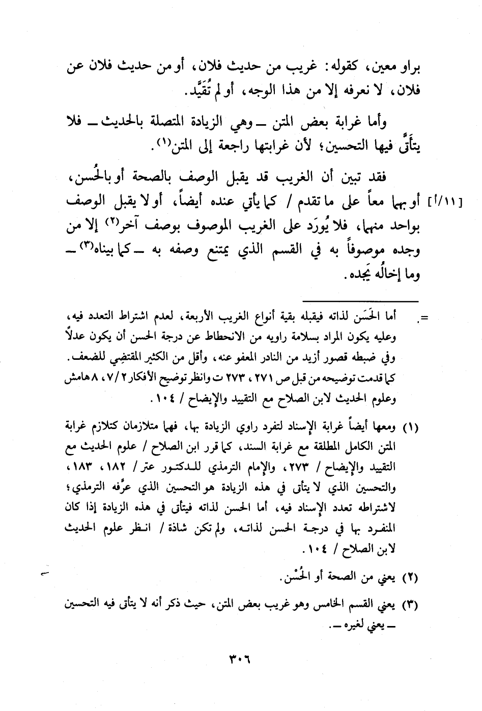 (¬1) ومعها أيضًا غرابة الإسناد لتفرد راوي الزيادة بها، فهما متلازمان كتلازم غرابة المتن الكامل المطلقة مع غرابة السند، كما قرر ابن الصلاح/ علوم الحديث مع التقييد والإيضاح/ 273، والإمام الترمذي للدكتور عتر / 182، 183، والتحسين الذي لا يتأتى في هذه الزيادة هو التحسين الذي عرَّفه الترمذي؛ لاشتراطه تعدد الإسناد فيه، أما الحسن لذاته فيتأتى في هذه الزيادة إذا كان المنفرد بها في درجة الحسن لذاته، ولم تكن شاذة/ انظر علوم الحديث لابن الصلاح/ 104.