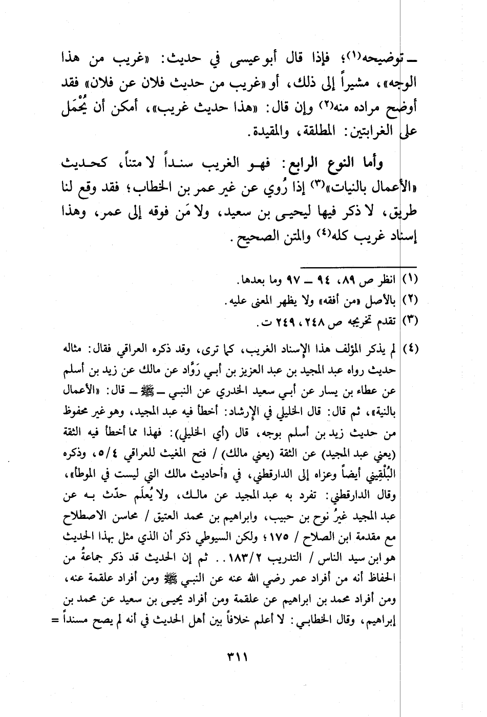 وأما النوع الرابع: فهو الغريب سندًا لا متنًا، كحديث "الأعمال بالنيات" (¬3) إذا رُوي عن غير عمر بن الخطاب؛ فقد وقع لنا طريق، لا ذكر فيها ليحيى بن سعيد، ولا مَن فوقه إلى عمر، وهذا إسناد غريب كله (¬4) والمتن الصحيح.