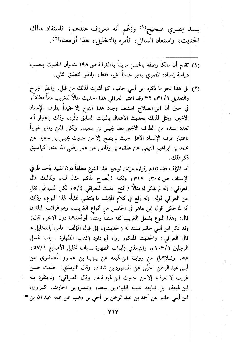 (¬2) بل هذا نحو ما ذكره ابن أبي حاتم، كما أشرت لذلك من قبل، وانظر الجرح والتعديل 1/ 31، 32 وقد اعتبر العراقي هذا الحديث مثالًا للغريب متنًا مطلقًا، في حين أن ابن الصلاح استبعد وجود هذا النوع إلا مقيدًا بطرف الإسناد الأخير، ومثل لذلك بحديث الأعمال بالنيات السابق ذكْره، وذلك باعتبار أنه تعدد سنده من الطرف الأخير بعد يحيى بن سعيد، ولكن المتن يعتبر غريبًا باعتبار طرف الإسناد الأعلى حيث لم يصح إلا من حديث يحيى بن سعيد عن محمد بن ابراهيم التيمي عن علقمة بن وقاص عن عمر رضي الله عنه، كما سبق ذكر ذلك.