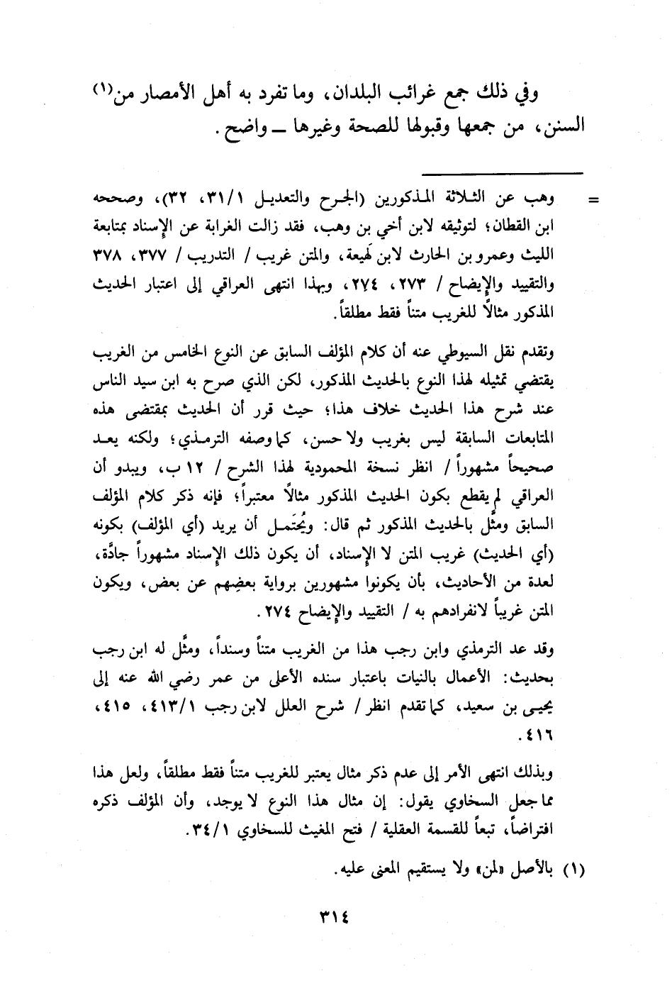 وبذلك انتهى الأمر إلى عدم ذكر مثال يعتبر للغريب متنًا فقط مطلقًا، ولعل هذا مما جعل السخاوي يقول: إن مثال هذا النوع لا يوجد، وأن المؤلف ذكره افتراضًا، تبعًا للقسمة العقلية/ فتح المغيث للسخاوي 1/ 34.