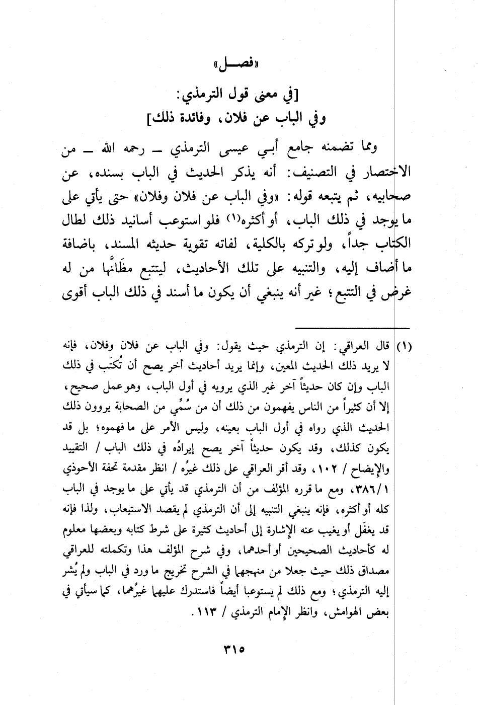 (¬1) قال العراقي: إن الترمذي حيث يقول: وفي الباب عن فلان وفلان، فإنه لا يريد ذلك الحديث المعين، وإنما يريد أحاديث أخر يصح أن تُكتَب في ذلك الباب وإن كان حديثًا آخر غير الذي يرويه في أول الباب، وهو عمل صحيح، إلا أن كثيرًا من الناس يفهمون من ذلك أن من سُمِّي من الصحابة يروون ذلك الحديث الذي رواه في أول الباب بعينه، وليس الأمر على ما فهموه؛ بل قد يكون كذلك، وقد يكون حديثًا آخر يصح إيراذه في ذلك الباب/ التقييد والإيضاح/ 102، وقد أقر العراقي على ذلك غيرُه/ انظر مقدمة تحفة الأحوذي 1/ 386، ومع ما قرره المؤلف من أن الترمذي قد يأتي على ما يوجد في الباب كله أو أكثره، فإنه ينبغي التنبيه إلى أن الترمذي لم يقصد الاستيعاب، ولذا فإنه قد يغفَل أو يغيب عنه الإشارة إلى أحاديث كثيرة على شرط كتابه وبعضها معلوم له كأحاديث الصحيحين أو أحدهما، وفي شرح المؤلف هذا وتكملته للعراقي مصداق ذلك حيث جعلا من منهجهما في الشرح تخريج ما ورد في الباب ولم يُشر إليه الترمذي؛ ومع ذلك لم يستوعبا أيضًا فاستدرك عليهما غيرُهما، كما سيأتي في بعض الهوامش، وانظر الإمام الترمذي/ 113.