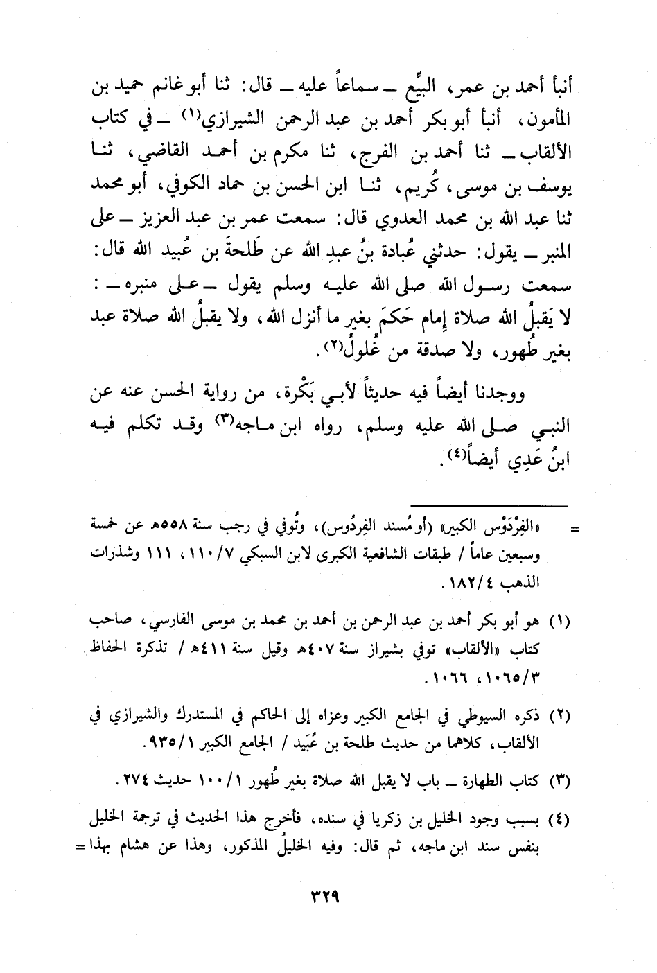 أنبا أحمد بن عمر، البيِّع -سماعًا عليه- قال: ثنا أبو غانم حميد بن المأمون، أنبا أبو بكر أحمد بن عبد الرحمن الشيرازي (¬1) -في كتاب الألقاب- ثنا أحمد بن الفرج، ثنا مكرم بن أحمد القاضي، ثنا يوسف بن موسى، كُريم، ثنا ابن الحسن بن حماد الكوفي، أبو محمد ثنا عبد الله بن محمد العدوي قال: سمعت عمر بن عبد العزيز -على المنبر- يقول: حدثني عُبادة بنُ عبدِ الله عن طَلحةَ بن عُبيد الله قال: سمعت رسول الله صلى الله عليه وسلم يقول -على منبره-: لا يَقبلُ الله صلاة إِمام حَكمَ بغير ما أنزل الله، ولا يقبلُ الله صلاة عبد بغير طُهور، ولا صدقة من غُلولُ (¬2).