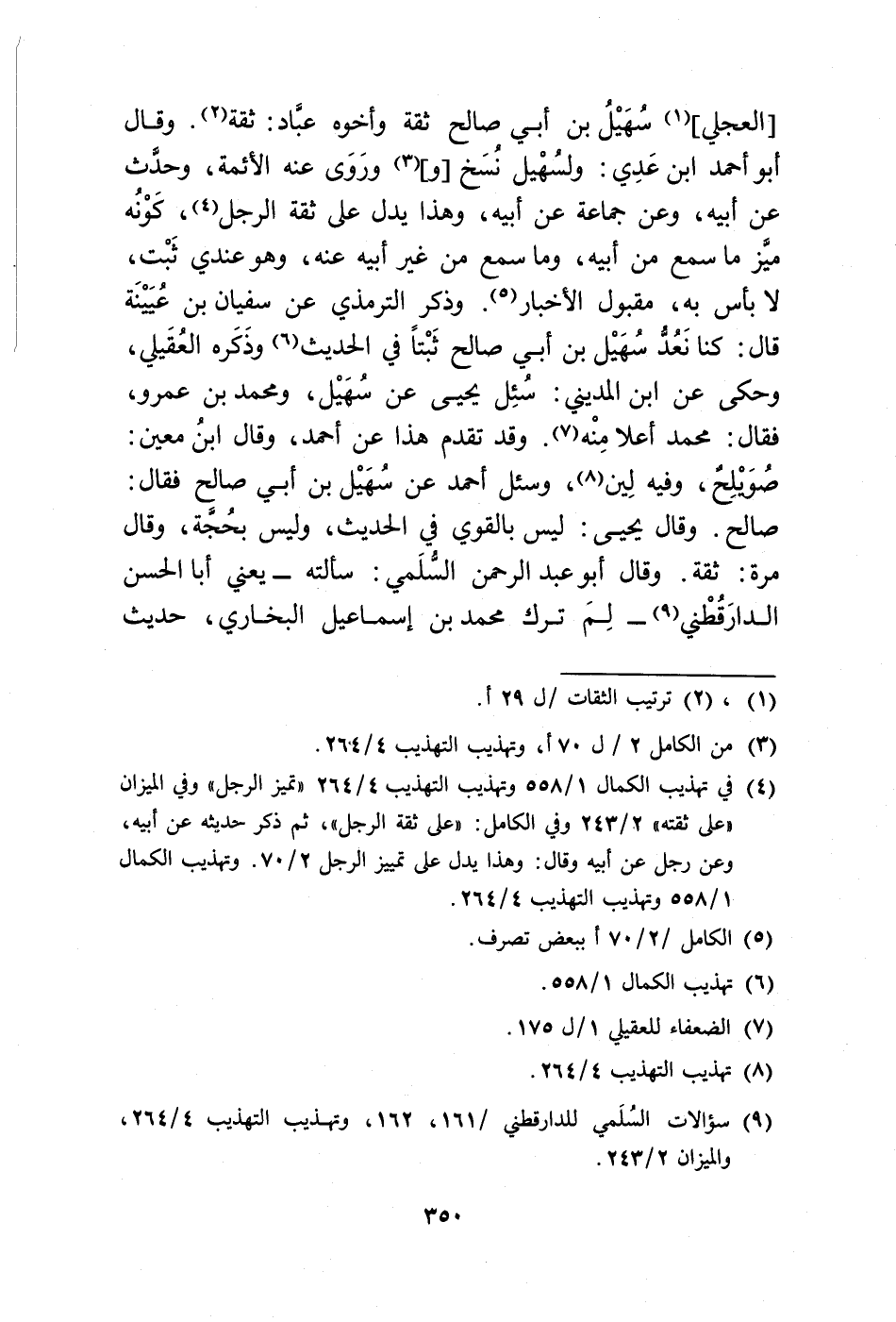 [العجلي] (¬1) سُهَيْلُ بن أبي صالح ثقة وأخوه عبَّاد: ثقة (¬2). وقال أبو أحمد ابن عَدِي: ولسُهْيل نُسَخ [و] (¬3) ورَوَى عنه الأئمة، وحدَّث عن أبيه، وعن جماعة عن أبيه، وهذا يدل على ثقة الرجل (¬4)، كَوْنُه ميَّز ما سمع من أبيه، وما سمع من غير أبيه عنه، وهو عندي ثَبْت، لا بأس به، مقبول الأخبار (¬5). وذكر الترمذي عن سفيان بن عُيَيْنَة قال: كنا نَعُدُّ سُهيْل بن أبي صالح ثَبْتًا في الحديث (¬6) وذَكَره العُقَيلي، وحكى عن ابن المديني: سُئِل يحيى عن سُهَيْل، ومحمد بن عمرو، فقال: محمد أعلا مِنْه (¬7). وقد تقدم هذا عن أحمد، وقال ابنُ معين: صُوَيْلِحُ، وفيه لِين (¬8)، وسئل أحمد عن سُهيْل بن أبي صالح فقال: صالح. وقال يحيى: ليس بالقوي في الحديث، وليس بحُجَّة، وقال مرة: ثقة. وقال أبو عبد الرحمن السُّلَمي: سألته -يعني أبا الحسن الدارَقُطْني (¬9) - لِمَ ترك محمد بن إسماعيل البخاري، حديث