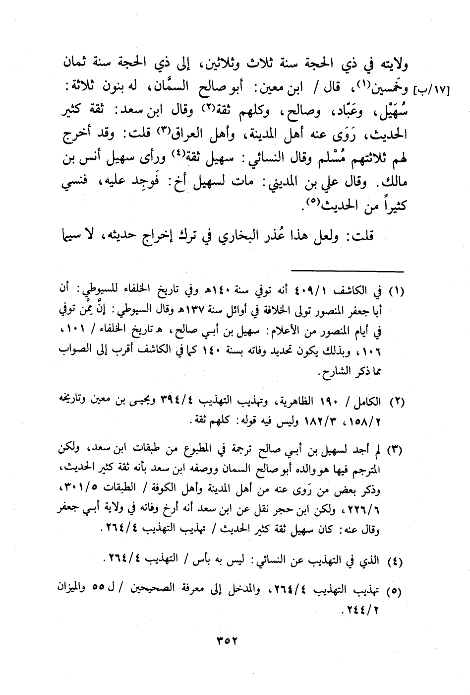 (¬1) في الكاشف 1/ 409 أنه توفي سنة 140 هـ وفي تاريخ الخلفاء للسيوطي: أن أبا جعفر المنصور تولى الخلافة في أوائل سنة 137 هـ وقال السيوطي: إنَّ مِمَّن توفي في أيام المنصور من الأعلام: سهيل بن أبي صالح، هـ تاريخ الخلفاء/ 101، 106، وبذلك يكون تحديد وفاته بسنة 140 كما في الكاشف أقرب إلى الصواب مما ذكر الشارح.
