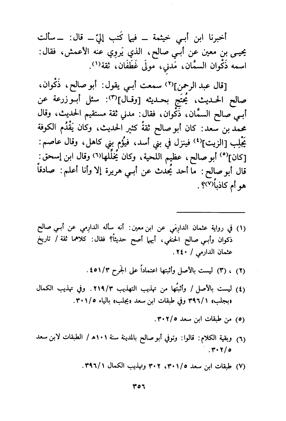 (¬6) وبقية الكلام: قالوا: وتوفي أبو صالح بالمدينة سنة 101 هـ/ الطبقات لابن سعد 5/ 302.