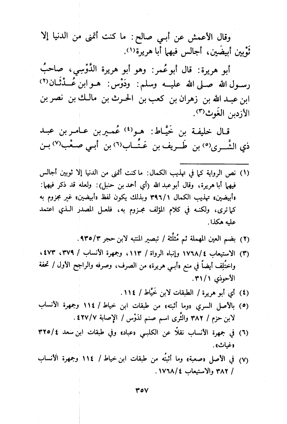 (¬1) نص الرواية كما في تهذيب الكمال: ما كنت أتمنى من الدنيا إلا ثوبين أجالس فيهما أبا هريرة، وقال أبو عبد الله (أي أحمد بن حنبل): ولعله قد ذكر فيهما: "أبيضين" تهذيب الكمال 1/ 396 وبذلك يكون لفظ "أبيضين" غير مجزوم به كما ترى، ولكنه في كلام المؤلف مجزوم به، فلعل المصدر الذي اعتمد عليه هكذا.