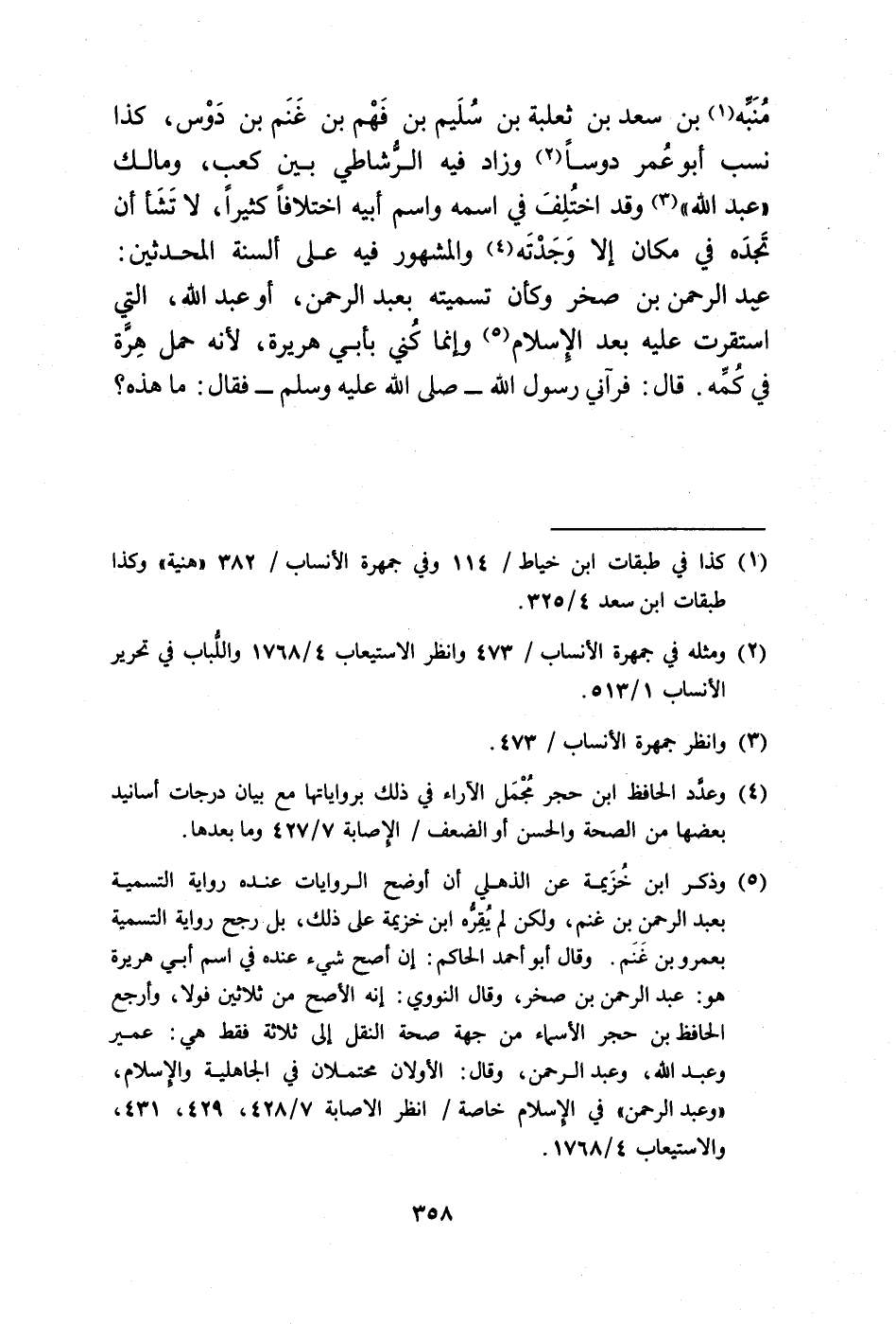 (¬5) وذكر ابن خُزَيمة عن الذهلي أن أوضح الروايات عنده رواية التسمية بعبد الرحمنِ بن غنم، ولكن لم يُقِرُّه ابن خزيمة على ذلك، بل رجح رواية التسمية بعمرو بن غنَم. وقال أبو أحمد الحاكم: إن أصح شيء عنده في اسم أبي هريرة هو: عبد الرحمن بن صخر، وقال النووي: إنه الأصح من ثلاثين قولا، وأرجع الحافظ بن حجر الأسماء من جهة صحة النقل الى ثلاثة فقط هي: عمير وعبد الله، وعبد الرحمن، وقال: الأولان محتملان في الجاهلية والإسلام، "وعبد الرحمن" في الإسلام خاصة/ انظر الاصابة 7/ 428، 429، 431، والاستيعاب 4/ 1768.