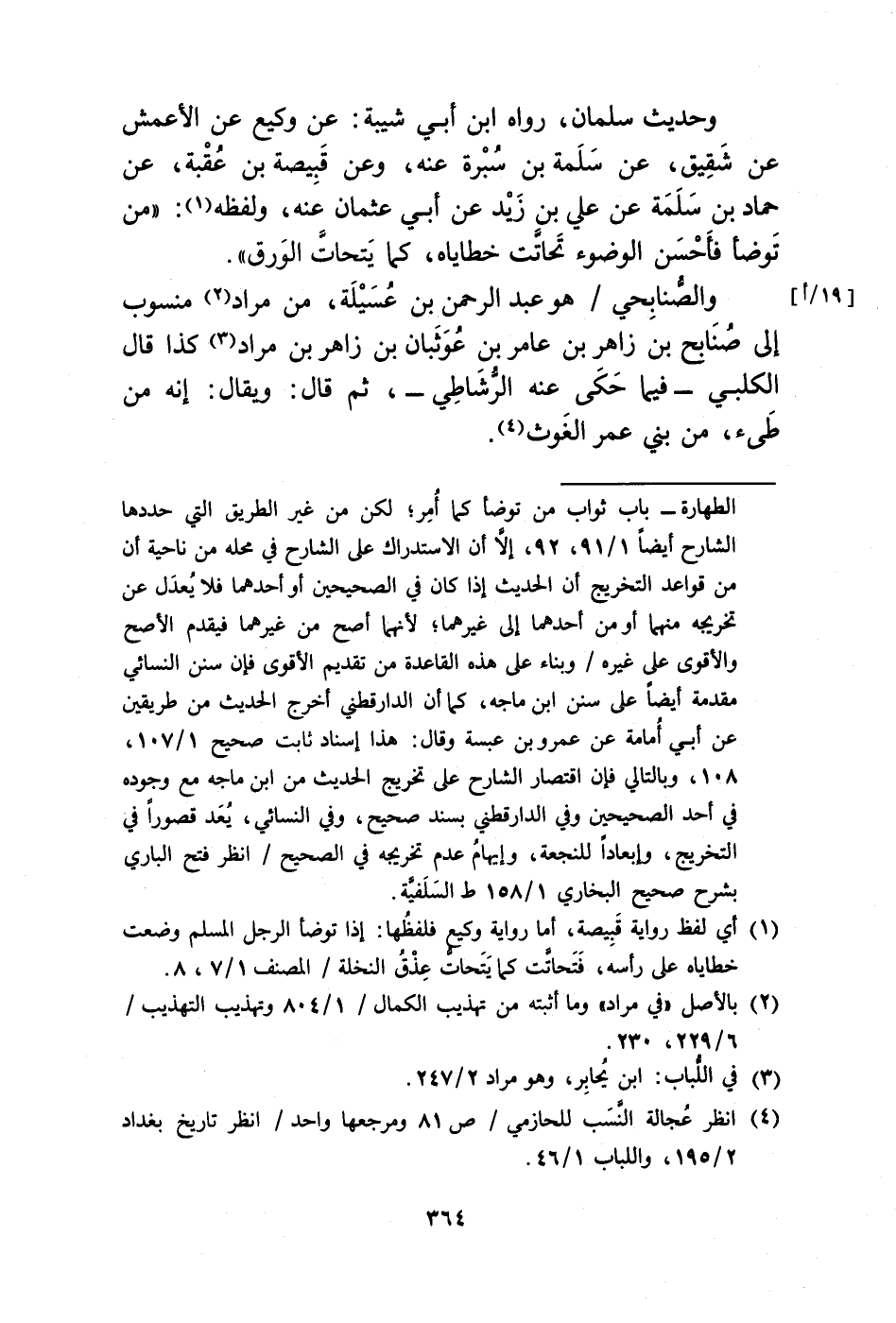 = الطهارة - باب ثواب من توضأ كما أُمِر؛ لكن من في الطريق التي حددها الشارح أيضًا 1/ 91، 92، إلَّا أن الاستدراك على الشارح في محله من ناحية أن من قواعد التخريج أن الحديث إذا كان في الصحيحين أو أحدهما فلا يُعدَل عن تخريجه منهما أو من أحدهما الى غيرهما؛ لأنهما أصح من غيرهما فيقدم الأصح والأقوى على غيره/ وبناء على هذه القاعدة من تقديم الأقوى فإن سنن النسائي مقدمة أيضًا على سنن ابن ماجه، كما أن الدارقطني أخرج الحديث من طريقين عن أبي أُمامة عن عمرو بن عبسة وقال: هذا إسناد ثابت صحيح 1/ 107، 108، وبالتالي فإن اقتصار الشارح على تخريج الحديث من ابن ماجه مع وجوده في أحد الصحيحين وفي الدارقطني بسند صحيح، وفي النسائي، يُعَد قصورًا في التخريج، وإبعادًا للنجعة، وإيهامُ عدم تخريجه في الصحيح/ انظر فتح الباري بشرح صحيح البخاري 1/ 158 ط السَلَفيَّة.