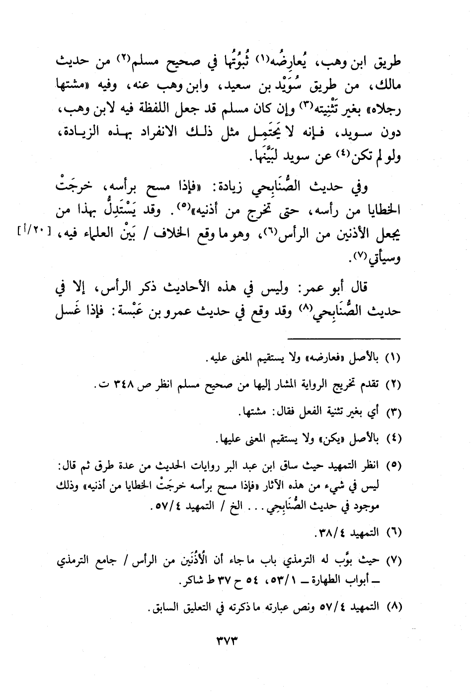 (¬5) انظر التمهيد حيث ساق ابن عبد البر روايات الحديث من عدة طرق ثم قال: ليس في شيء من هذه الآثار "فإذا مسح برأسه خرجَتْ الخطايا من أذنيه" وذلك موجود في حديث الصُّنَابِحِي ... الخ/ التمهيد 4/ 57.