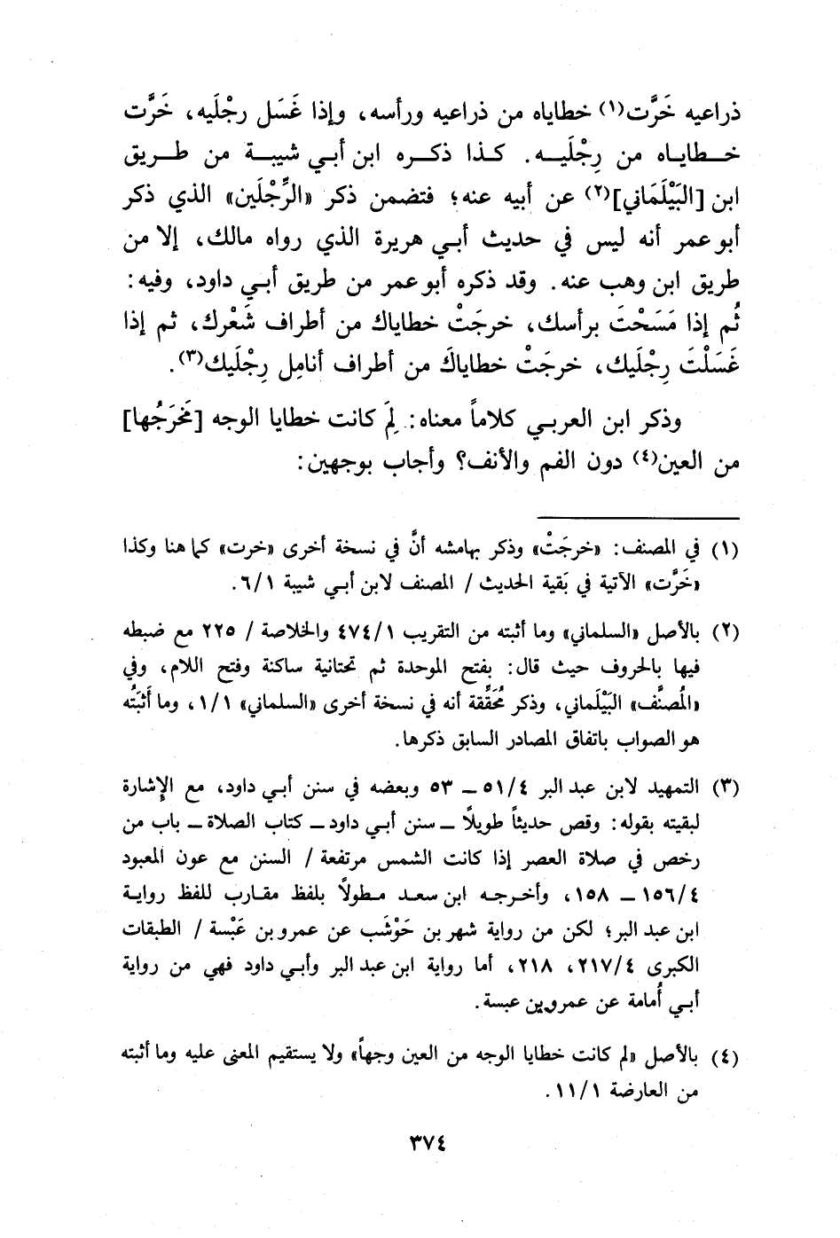 ذراعيه خَرَّت (¬1) خطاياه من ذراعيه ورأسه، وإذا غَسَل رجْلَيه، خَرَّت خطاياه من رِجْلَيه. كذا ذكره ابن أبي شيبة من طريق ابن [البَيْلَمَاني] (¬2) عن أبيه عنه؛ فتضمن ذكر "الرِّجْلَين" الذي ذكر أبو عمر أنه ليس في حديث أبي هريرة الذي رواه مالك، إلا من طريق ابن وهب عنه. وقد ذكره أبو عمر من طريق أبي داود، وفيه: ثُم إذا مَسَحْتَ برأسك، خرجَتْ خطاياك من أطراف شَعْرك، ثم إذا غَسَلْتَ رِجْلَيك، خرجَتْ خطاياكَ من أطراف أنامِل رِجْلَيك (¬3).