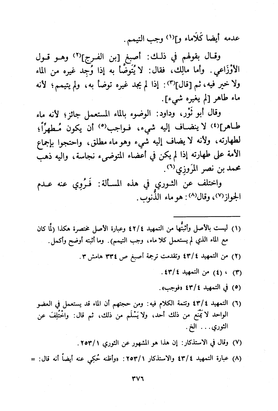 (¬6) التمهيد 4/ 43 وتتمة الكلام فيه: ومن حجتهم أن الماء قد يستعمل في العضو الواحد لا يَمْنَع من ذلك أحد، ولا يَسْلَم من ذلك، ثم قال: واخْتُلِفَ عن الثوري .... الخ.