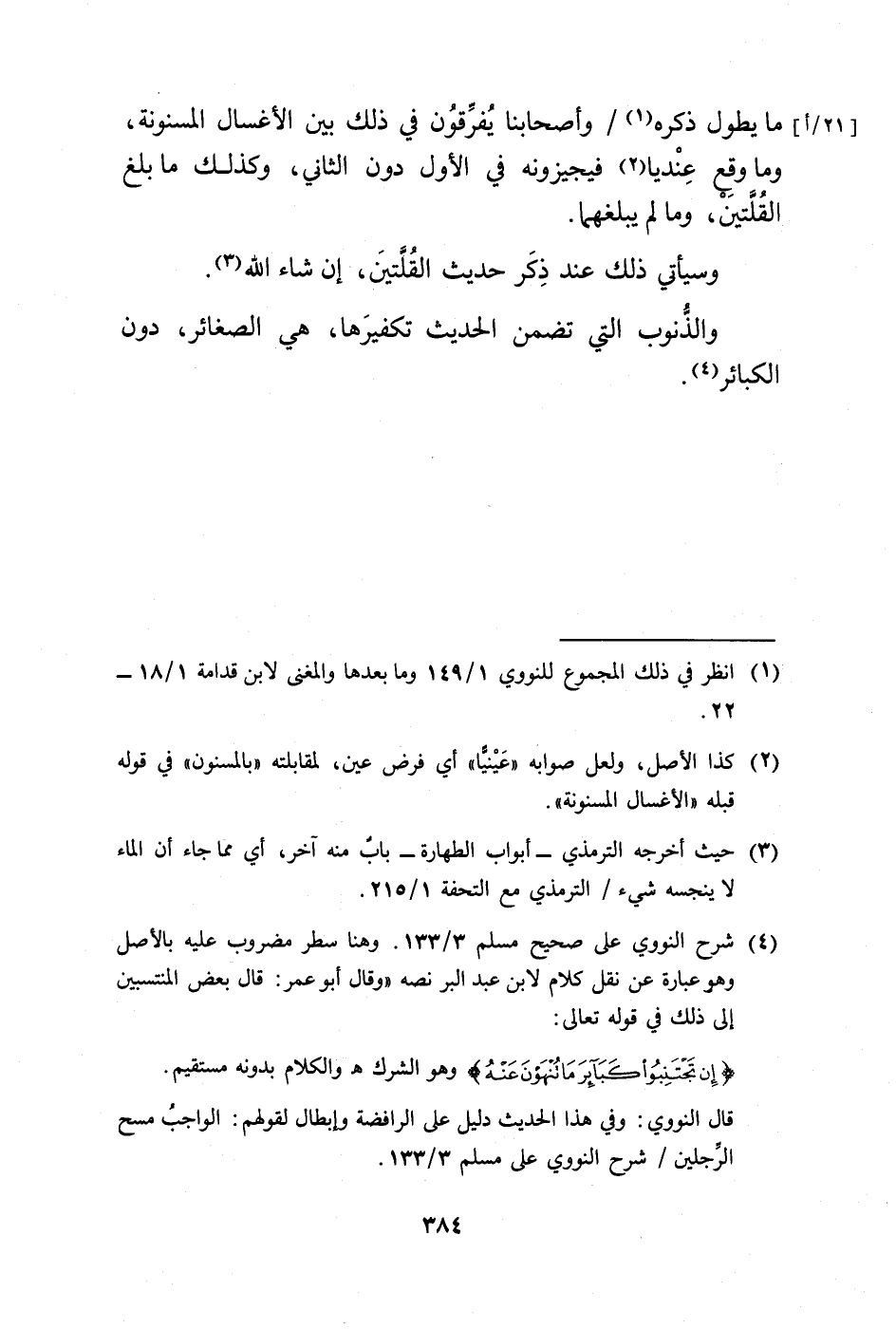 (¬4) شرح النووي على صحيح مسلم 3/ 133. وهنا سطر مضروب عليه بالأصل وهو عبارة عن نقل كلام لابن عبد البر نصه "وقال أبو عمر: قال بعض المنتسبين إلى ذلك في قوله تعالى: {إِنْ تَجْتَنِبُوا كَبَائِرَ مَا تُنْهَوْنَ عَنْه} وهو الشرك هـ والكلام بدونه مستقيم.