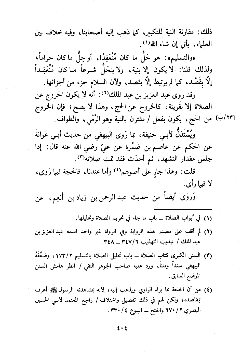 "والتسليم": هو حَلُّ ما كان مُنْعَقِدًا، أو حِلُّ ما كان حرامًا؛ ولذلك قلنا: لا يكون إلا بنية، ولا ينحَلُّ شرعًا ما كان مُنْعَقِدًا إلَّا بِقَصْد، كما لم يرتبط إلّا بقصد، ولأن السلام جزء من أجزائها.