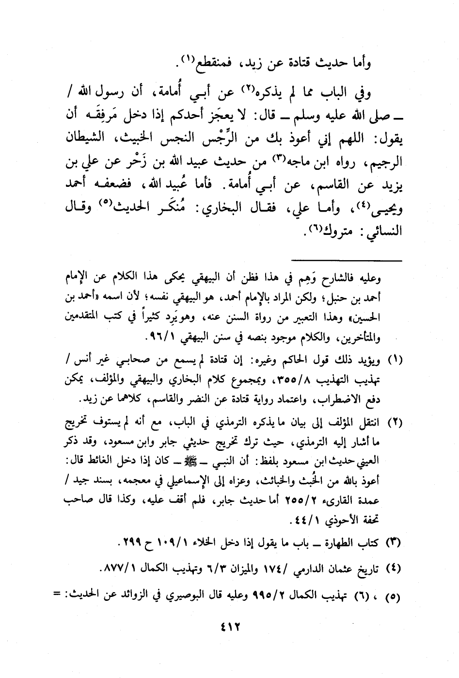 (¬5) تهذيب الكمال 2/ 995 وعليه قال البوصيري في الزوائد عن الحديث: إسنادُه ضعيف، قال ابن حبان: إذا اجتمع في إسنادِ خَبر: عُبيد الله بن زَحْر، وعلي بن يزيد، والقاسم، فذاك مما عملته أيديهم هـ. حاشية السِّندي على ابن ماجه 1/ 128.