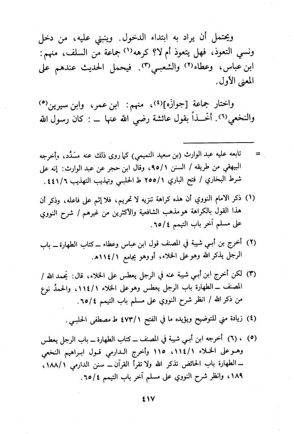 (¬5) أخرجه ابن أبي شيبة في المصنف - كتاب الطهارة - باب الرجل يعطس وهو على الخلاء 1/ 114، 115 وأخرج الدارمي قول ابراهيم النخعي - الطهارة باب الحائض تذكر الله ولا تقرأ القرآن - سنن الدارمي 1/ 188، 189، وانظر شرح النووي على مسلم آخر باب التيمم 4/ 65.