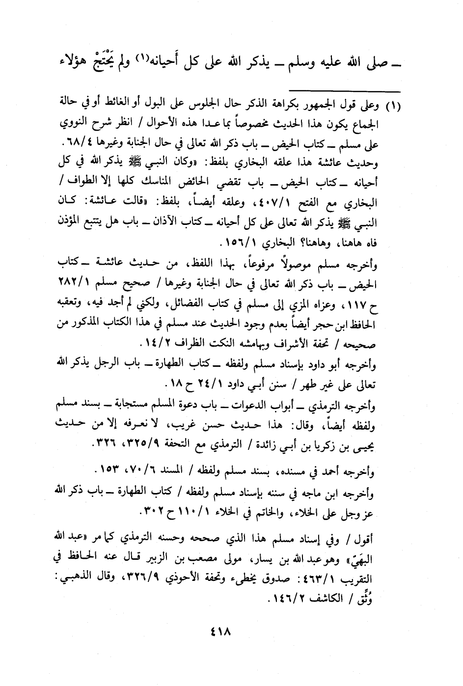 (¬1) وعلى قول الجمهور بكراهة الذكر حال الجلوس على البول أو الغائط أو في حالة الجماع يكون هذا الحديث مخصوصًا بما عدا هذه الأحوال/ انظر شرح النووي على مسلم - كتاب الحيض - باب ذكر الله تعالى في حال الجنابة وغيرها 4/ 68. وحديث عائشة هذا علقه البخاري بلفظ: "وكان النبي -صلى الله عليه وسلم- يذكر الله في كل أحيانه - كتاب الحيض - باب تقضي الحائض المناسك كلها إلا الطواف/ البخاري مع الفتح 1/ 407، وعلقه أيضًا، بلفظ: "قالت عائشة: كان النبي -صلى الله عليه وسلم- يذكر الله تعالى على كل أحيانه - كتاب الآذان - باب هل يتتبع المؤذن فاه هاهنا، وهاهنا؟ البخاري 1/ 156.