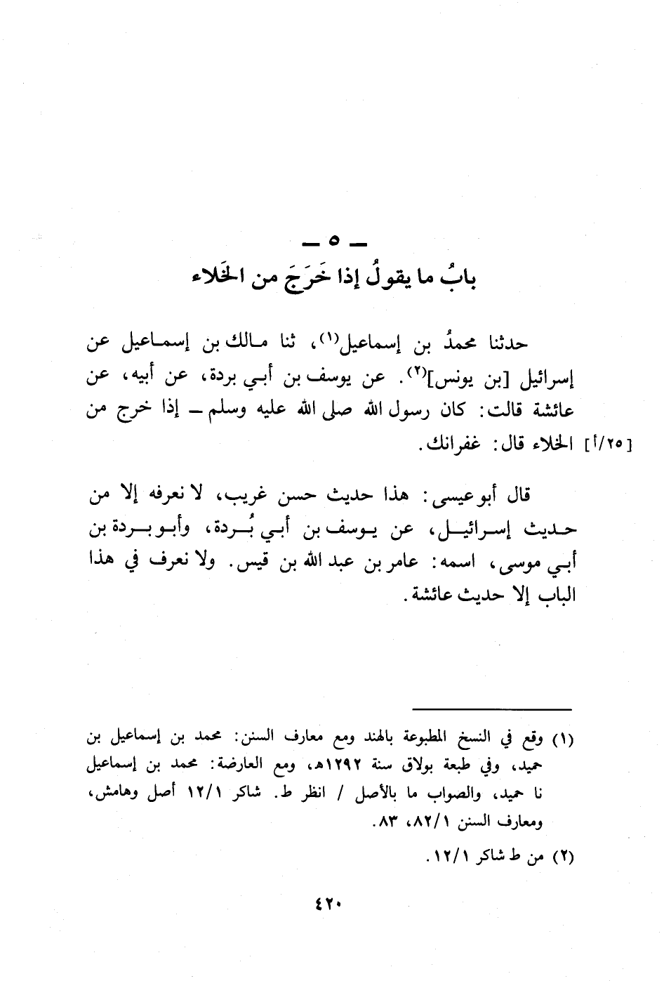 (¬1) وقع في النسخ المطبوعة بالهند ومع معارف السنن: محمد بن إسماعيل بن حميد، وفي طبعة بولاق سنة 1291 هـ، ومع العارضة: محمد بن إسماعيل نا حميد، والصواب ما بالأصل/ انظر ط. شاكر 1/ 12 أصل وهامش، ومعارف السنن 1/ 82، 83.