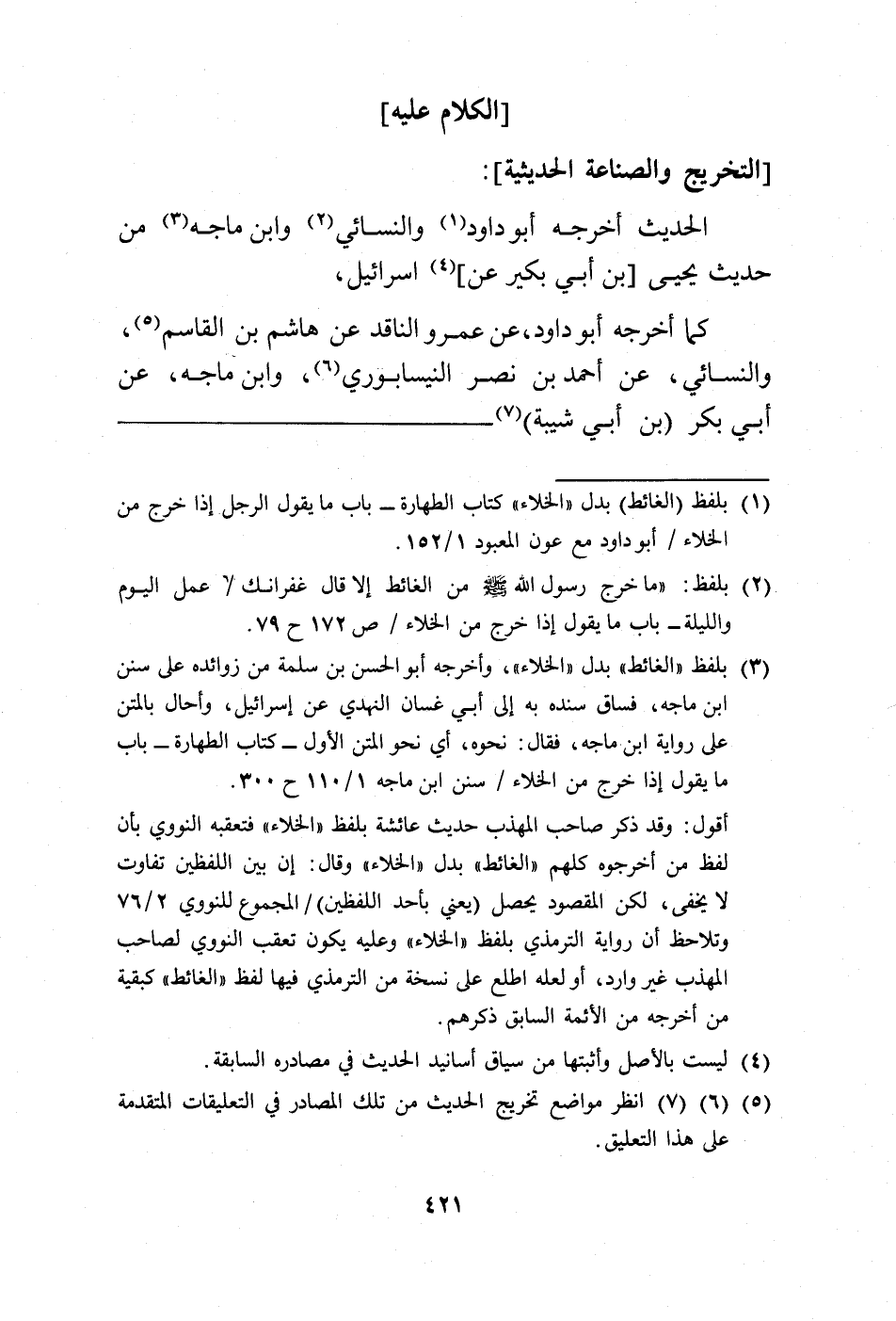 أقول: وقد ذكر صاحب المهذب حديث عائشة بلفظ "الخلاء" فتعقبه النووي بأن لفظ من أخرجوه كلهم "الغائط" بدل "الخلاء" وقال: إن بين اللفظين تفاوت لا يخفى، لكن المقصود يحصل (يعني بأحد اللفظين) / المجموع للنووي 2/ 76 وتلاحظ أن رواية الترمذي بلفظ "الخلاء" وعليه يكون تعقب النووي لصاحب المهذب غير وارد، أو لعله اطلع على نسخة من الترمذي فيها لفظ "الغائط" كبقية من أخرجه من الأئمة السابق ذكرهم.