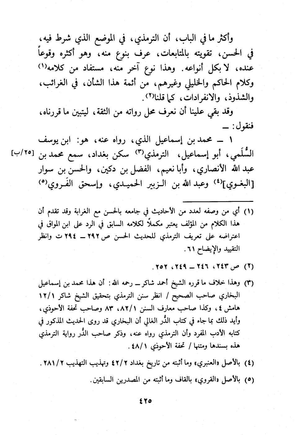 (¬3) وهذا خلف ما قرره الشيخ أحمد شاكر -رحمه الله: أن هذا محمد بن اسماعيل البخاري صاحب الصحيح/ انظر سنن الترمذي بتحقيق الشيخ شاكر 1/ 12 هامش 4، وكذا صاحب معارف السنن 1/ 82، 83 وصاحب تحفة الأحوذي، وأيد ذلك بما جاء في كتاب الدُّر الغالي أن البخاري قد روى الحديث المذكور في كتابه الأدب المفرد وأن الترمذي رواه عنه، وذكر صاحب الدُّر رواية الترمذي هذه بسندها ومتنها/ تحفة الأحوذي 1/ 48.