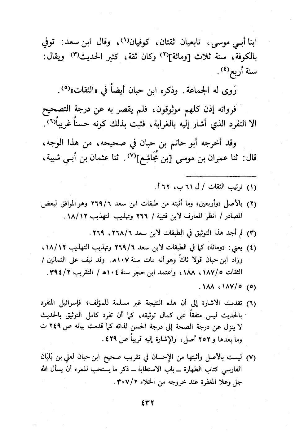 (¬6) تقدمت الاشارة إلى أن هذه النتيجة غير مسلمة للمؤلف؛ فإسرائيل النفرد بالحديث ليس متفقًا على كمال توثيقه، كما أن تفرد كامل التوثيق بالحديث لا ينزل عن درجة الصحة إلى درجة الحسن لذاته كما قدمت بيانه ص 249 ت وما بعدها و 252 أصل، والإشارة إليه قريبًا ص 429.