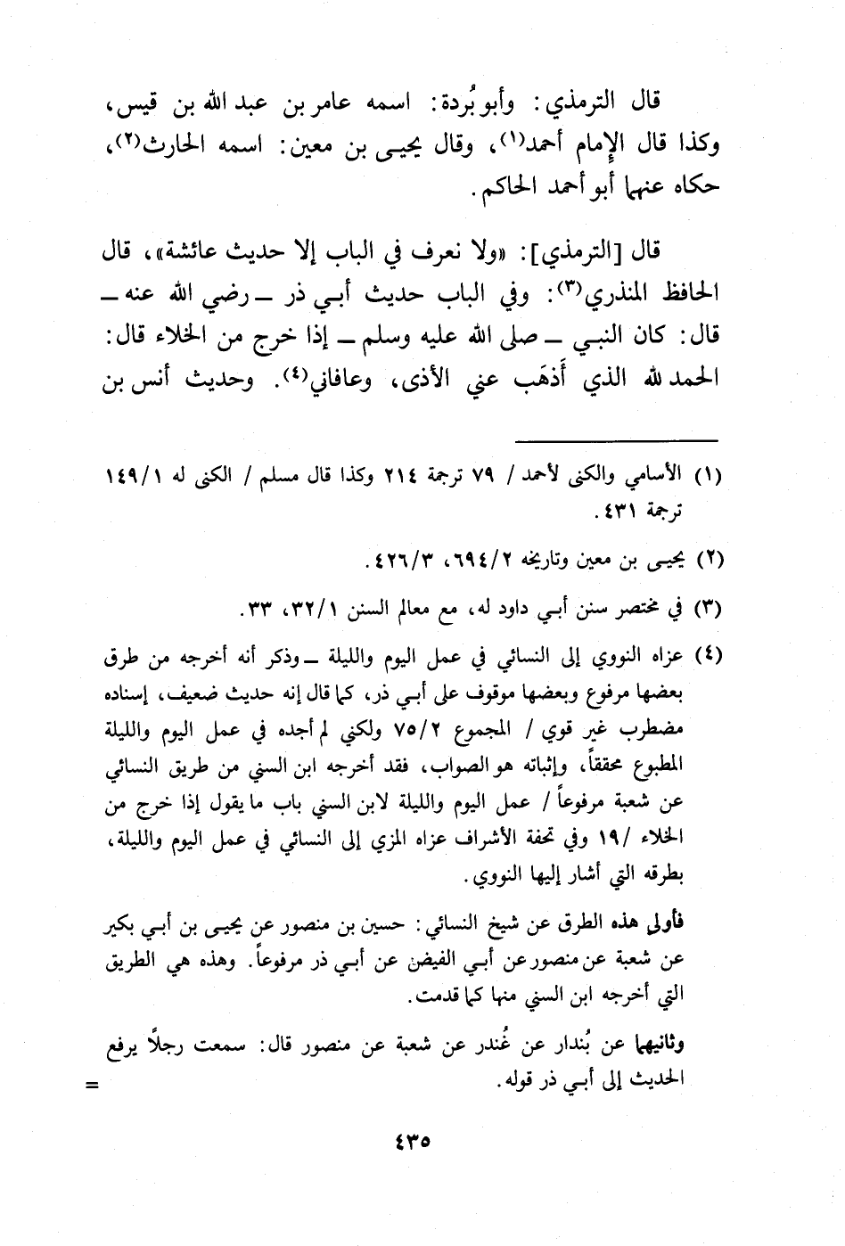 (¬4) عزاه النووي إلى النسائي في عمل اليوم والليلة - وذكر أنه أخرجه من طرق بعضها مرفوع وبعضها موقوف على أبي ذر، كما قال إنه حديث ضعيف، إسناده مضطرب غير قوي/ المجموع 2/ 75 ولكني لم أجده في عمل اليوم والليلة المطبوع محققًا، وإثباته هو الصواب، فقد أخرجه ابن السني من طريق النسائي عن شعبة مرفوعًا/ عمل اليوم والليلة لابن السني باب ما يقول إذا خرج من الخلاء/ 19 وفي تحفة الأشراف عزاه المزي إلى النسائي في عمل اليوم والليلة، بطرقه التي أشار إليها النووي.