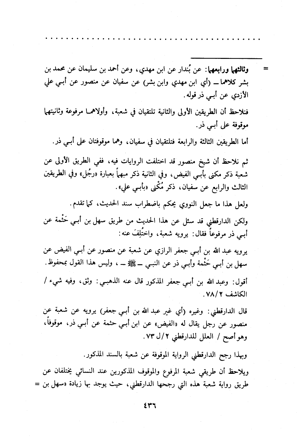 = وثالثهما ورابعهما: عن بُندار عن ابن مهدي، وعن أحمد بن سليمان عن محمد بن بشر كلاهما - (أي ابن مهدي وابن بشر) عن سفيان عن منصور عن أبي علي الأزدي عن أبي ذر قوله.