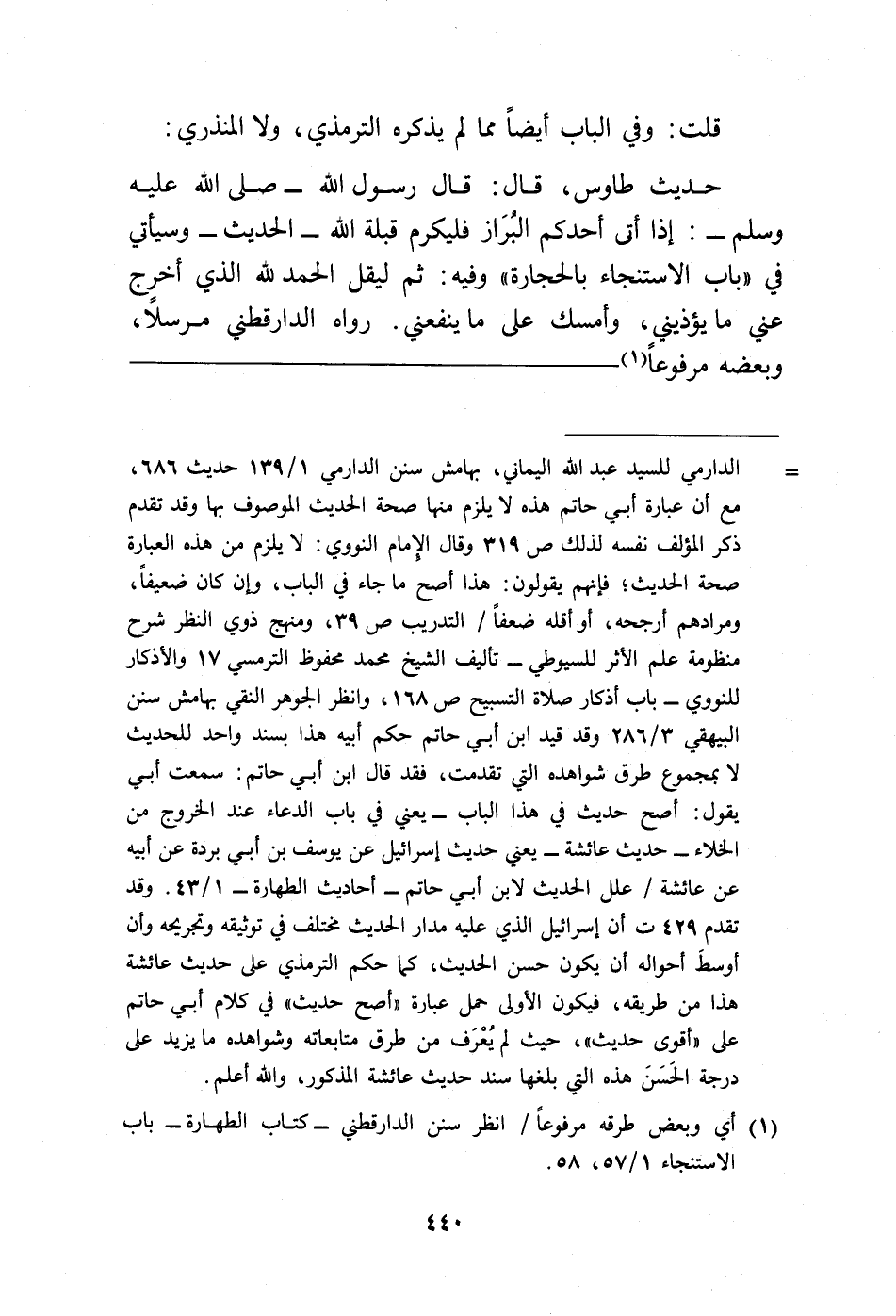 = الدارمي للسيد عبد الله اليماني، بهامش سنن الدارمي 1/ 139 حديث 686، مع أن عبارة أبي حاتم هذه لا يلزم منها صحة الحديث الموصوف بها وقد تقدم ذكر المؤلف نفسه لذلك ص 319 وقال الإمام النووي: لا يلزم من هذه العبارة صحة الحديث؛ فإنهم يقولون: هذا أصح ما جاء في الباب، وإن كان ضعيفًا، ومرادهم أرجحه، أو أقله ضعفًا/ التدريب ص 39، ومنهج ذوي النظر شرح منظومة علم الأثر للسيوطي - تأليف الشيخ محمد محفوظ الترمسي 17 والأذكار للنووي - باب أذكار صلاة التسبيح ص 168، وانظر الجوهر النقي بهامش سنن البيهقي 3/ 286 وقد قيد ابن أبي حاتم حكم أبيه هذا بسند واحد للحديث لا بمجموع طرق شواهده التي تقدمت، فقد قال ابن أبي حاتم: سمعت أبي يقول: أصح حديث في هذا الباب -يعني في باب الدعاء عند الخروج من الخلاء- حديث عائشة -يعني حديث اسرائيل عن يوسف بن أبي بردة عن أبيه عن عائشة/ علل الحديث لابن أبي حاتم- أحاديث الطهارة - 1/ 43. وقد تقدم 429 ت أن إسرائيل الذي عليه مدار الحديث مختلف في توثيقه وتجريحه وأن أوسطَ أحواله أن يكون حسن الحديث، كما حكم الترمذي على حديث عائشة هذا من طريقه، فيكون الأولى حمل عبارة "أصح حديث" في كلام أبي حاتم على "أقوى حديث"، حيث لم يُعْرَف من طرق متابعاته وشواهده ما يزيد على درجة الحَسَنَ هذه التي بلغها سند حديث عائشة المذكور، والله أعلم.
