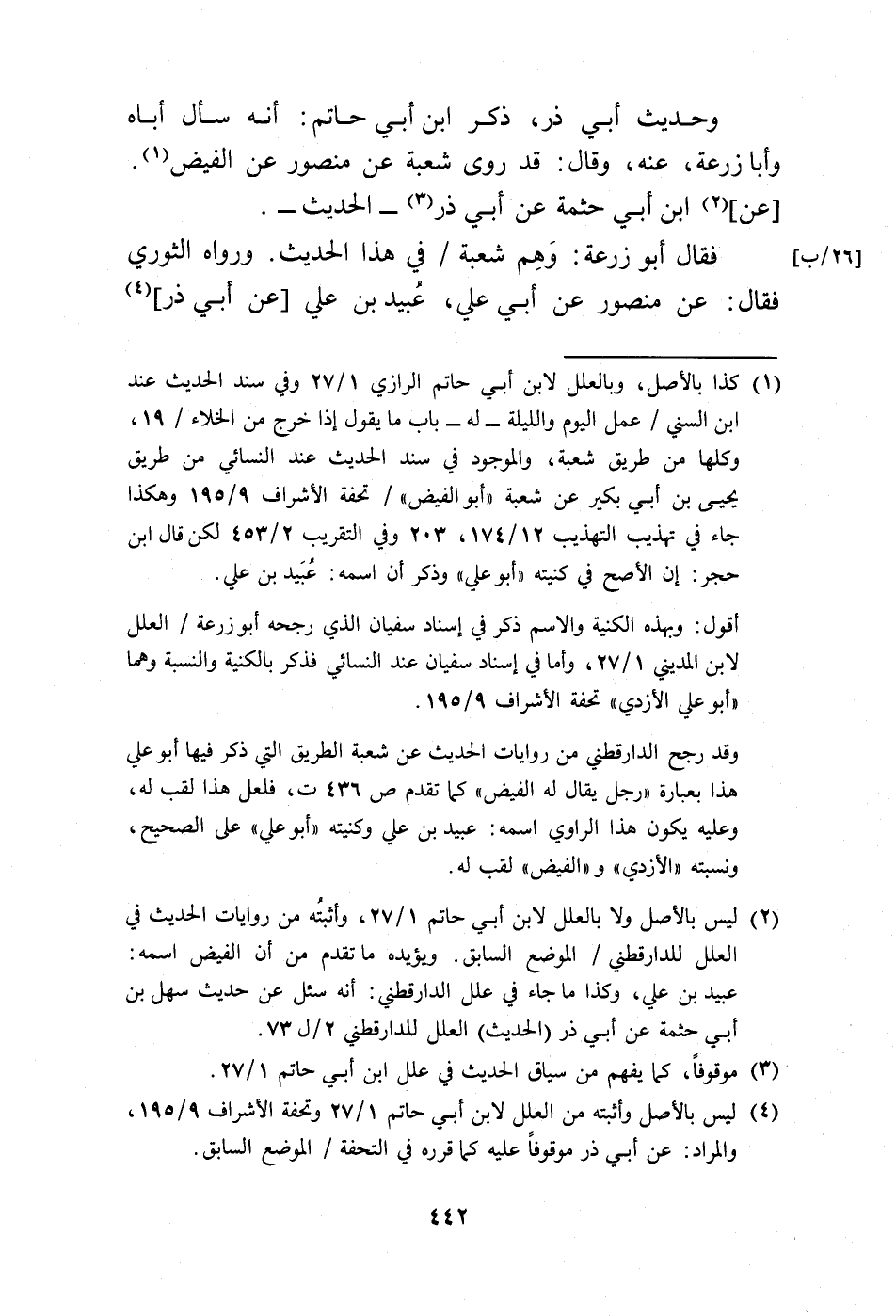 فقال أبو زرعة: وَهِم شعبة/ في هذا الحديث. ورواه الثوري فقال: عن منصور عن أبي علي، عُبيد بن علي [عن أبي ذر] (¬4)
